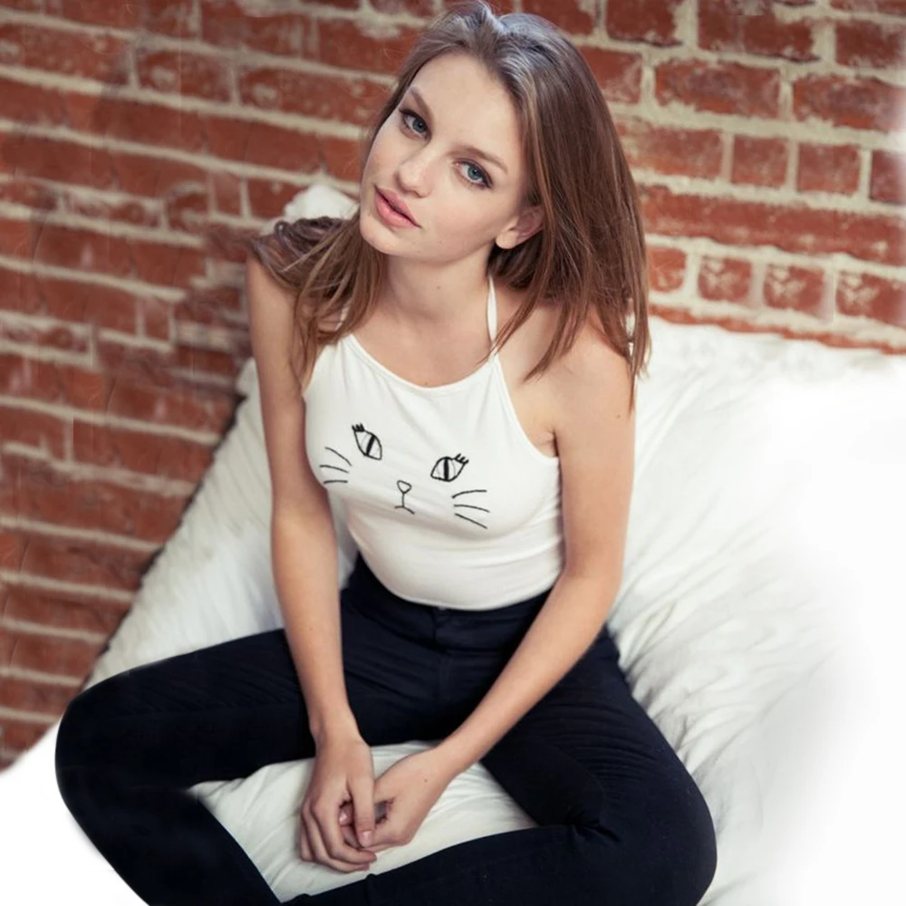 Женские топы без рукавов, летние топы с открытой спиной, милые топы с бретельками на шее, футболка с принтом кошачьей мордочки, повседневный женский жилет