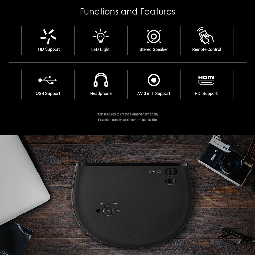 Этот Модернизированный Проектор использует технологию LCD с 50000 часами срока службы светодиодов, имеет яркость 3200 люмен (более ярче, чем обычная), 2000: 1 контрастность и разрешение 1280*800 поддержка видео в формате full HD 1080 P и обеспечение превосходного качества изображения для просмотра любимых фильмов. Оснащен двойным ТВ/HD/двойным USB/av-портом/VGA/разъемом для наушников, его легко подключить к ноутбукам, ПК, смартфонам, USB диски и отображение мультимедийных файлов (видео/Музыка/картинка/TXT). Это дает вам четкую рамку и размер проекции до 150 дюймов, вы также можете выбрать оптимальный размер изображения, регулируя расстояние (1-5 м) чтобы получить лучший пользовательский опыт. Вполне подходит для вечеринок или встреч, позволяя друзьям играть в игры, смотреть фильмы или представить слайды, также достаточно хорош для офиса и классной комнаты или любого внутреннего и наружного использования.