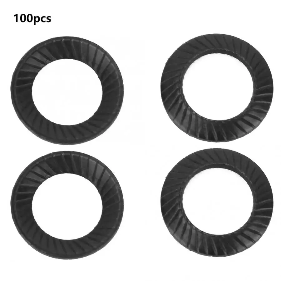 100% новый товар высокого качества. Изготовленные из высококачественной стали 65Mn, эти шайбы с замком прочные и долговечные. Всего 100 шайб в одном наборе, которые вы можете использовать в течение длительного времени.