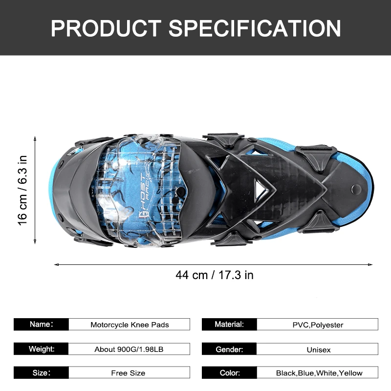 Название: наколенники для мотоцикла Материал: ПВХ, полиэстер Вес: около 900 г/фунтов Размеры: Бесплатные Размеры Цвет: черный, синий, белый, желтый Применение: мотоцикл, Велоспорт, гонки, катание на лыжах, катание на коньках, Мотокросс, Спорт на открытом воздухе и т. д.