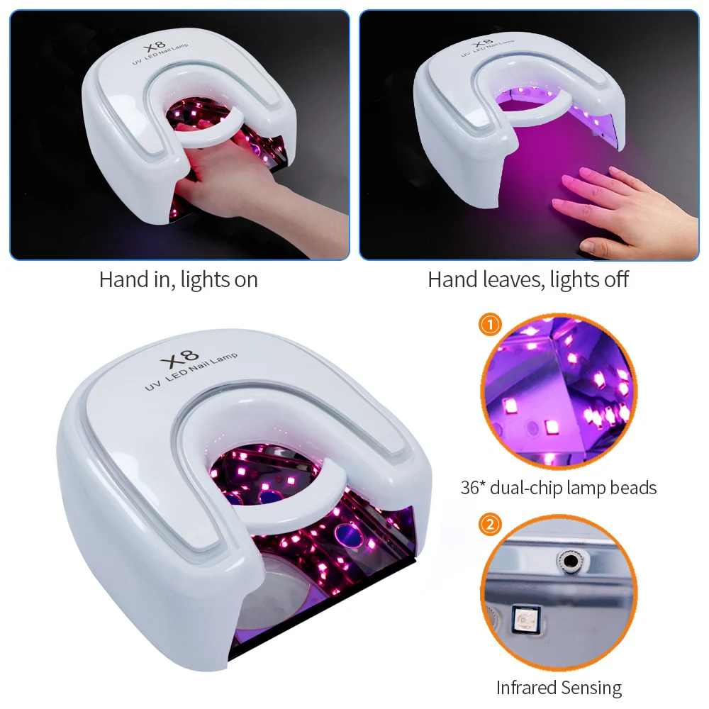 Ацетон доказательство ПК материал на верхней части корпуса Литиевая батарея @ 6000mA, Время работы батареи @ 5 часов, Время полной зарядки @ 1,5 часов Высокая мощность 48 w-36 pcs 365nm + 405nm светодиодный s-для быстрой сушки любых УФ или светодиодный гелей Чувствительная Сенсорная Кнопка с 4 ЖК-дисплей времени цифровой дисплей-таймер: 5s, 15 s, 30 s, 60 s USB порт удобный для зарядки мобильного телефона или банка питания Портативная ручка для удобной переноски Легко удаляемая пластина для педикюр Быстрый автоматический датчик activaited