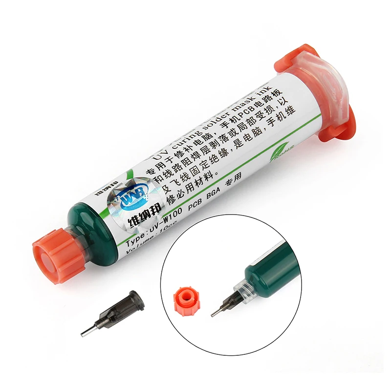 Изолирует печатную плату от коротких замыканий и дуг. Эта краска используется для защиты следов печатной платы от коррозии, влаги. Она также используется для ремонта печатных плат после пайки, переделки. Технические характеристики: Цвет: зеленый Длина шприца: около 9-10 см Материал: Краски Емкость: 10 мл Применение: Нанесите краску на печатную плату. Нанесите его на печатную плату, покрыв прозрачную пленку для маски. Поставьте под УФ-светильник (или солнце) на несколько минут. Удалите дополнительные краски с помощью бензина или масляного сольвента. Посылка включает в себя: 1 шт. УФ-отверждаемый припой + 1 игла