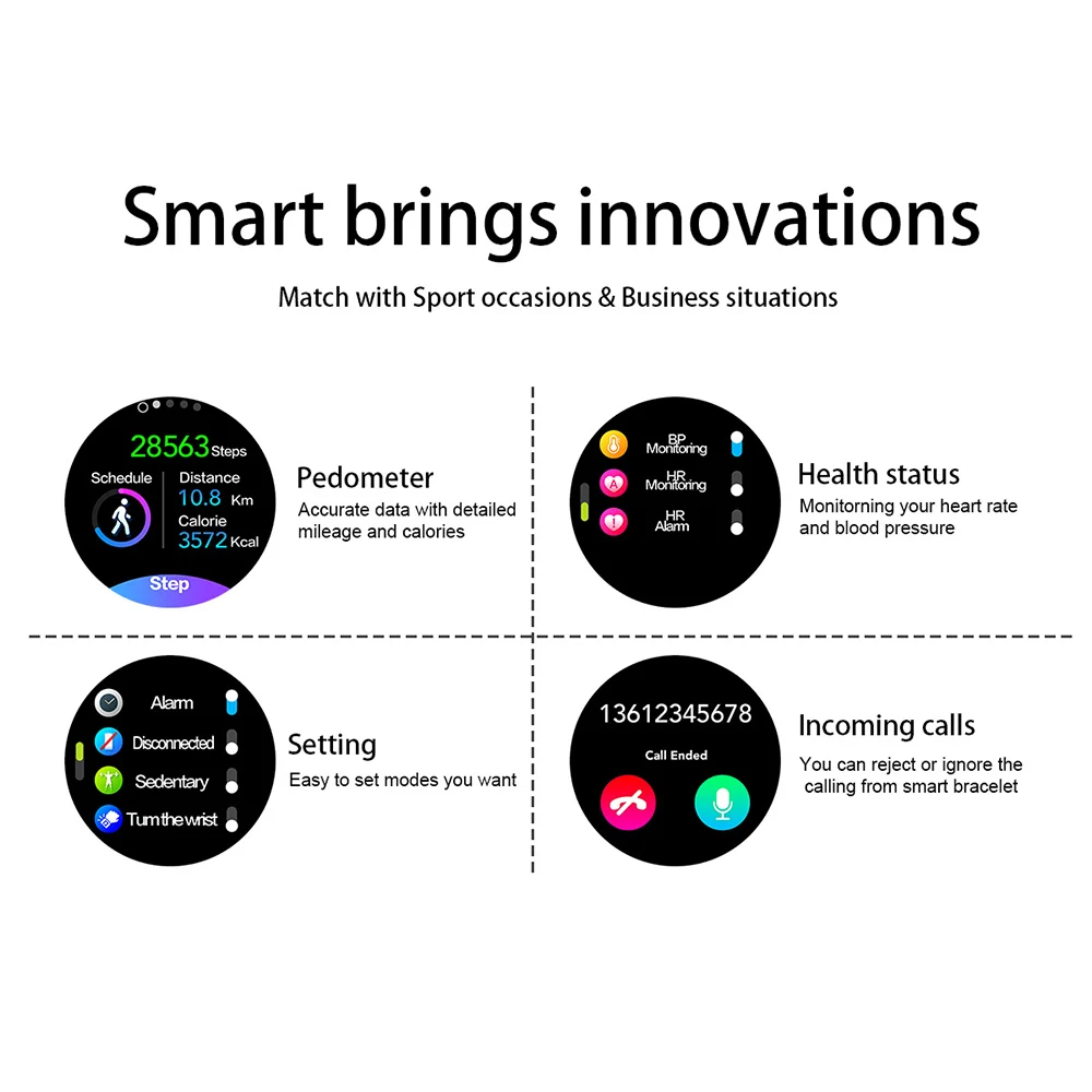 Функции: пульс, кровяное давление, шагомер, калории, расстояние, мониторинг сна (время сна, качество сна), секундомер, напоминания о звонках, SMS напоминание, напоминание о сообщениях, удаленная камера, будильник, напоминание о сидячем положении, синхронизация данных с APK/APP