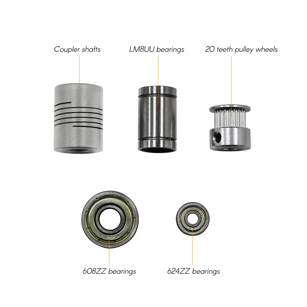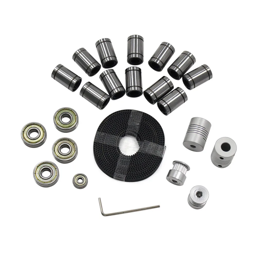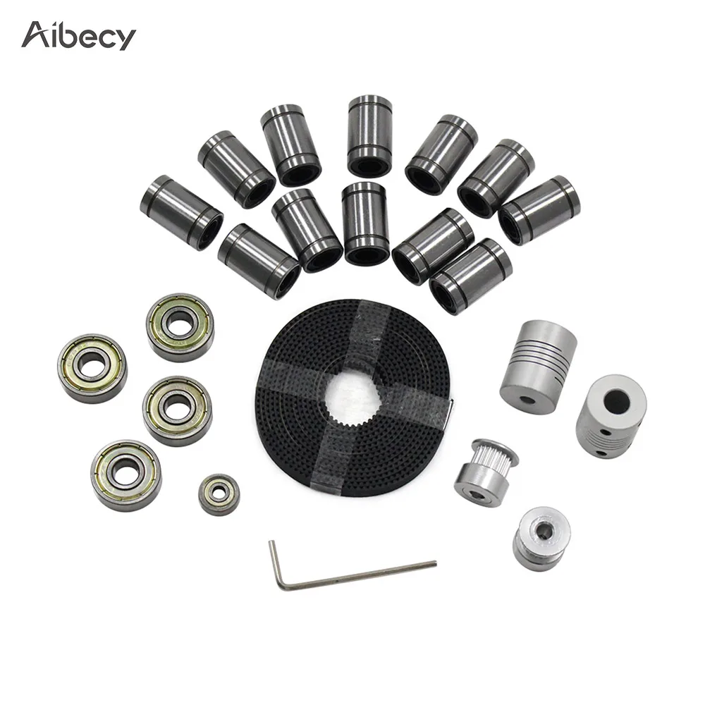 Набор инструментов поставляется с 12 * LM8UU подшипниками + 4 * 608ZZ подшипниками + 1 * 624ZZ подшипниками + 2 * соединительные валы + 2*20 зубчатые колеса + 2 метра GT2 ремни, достаточно для сборки.