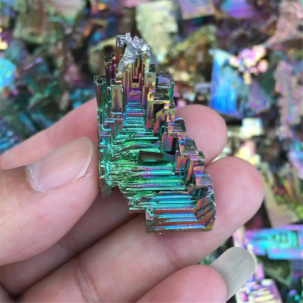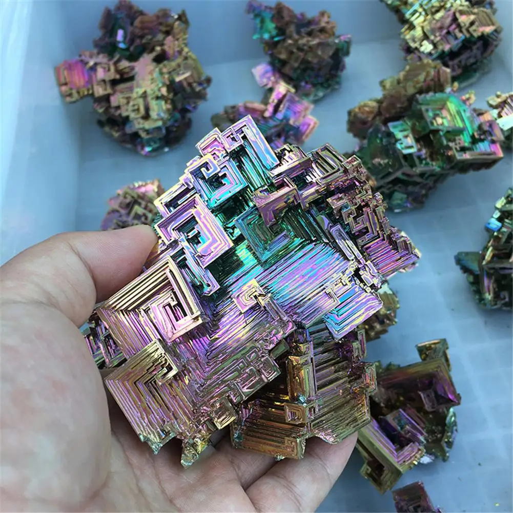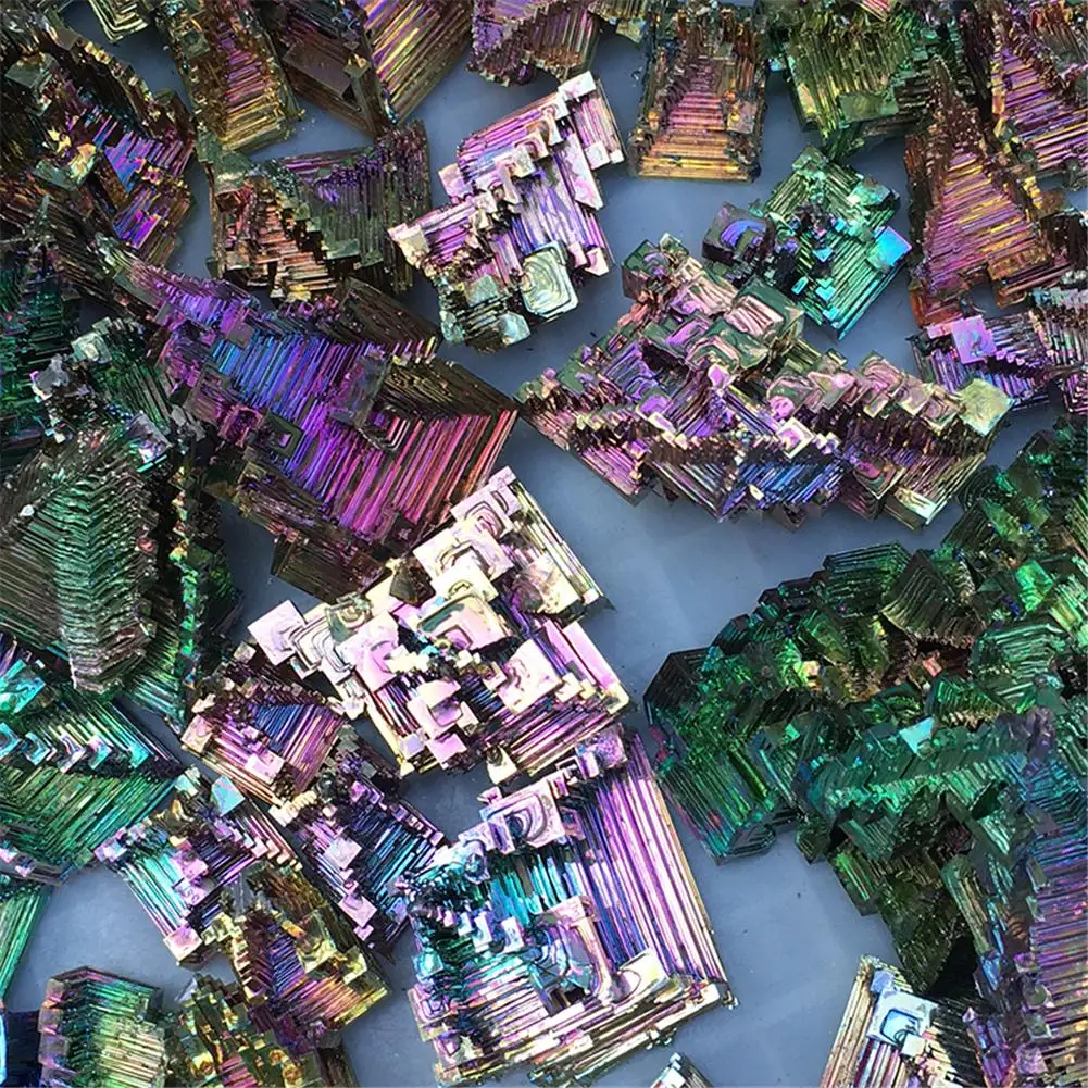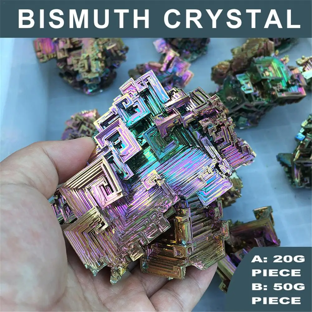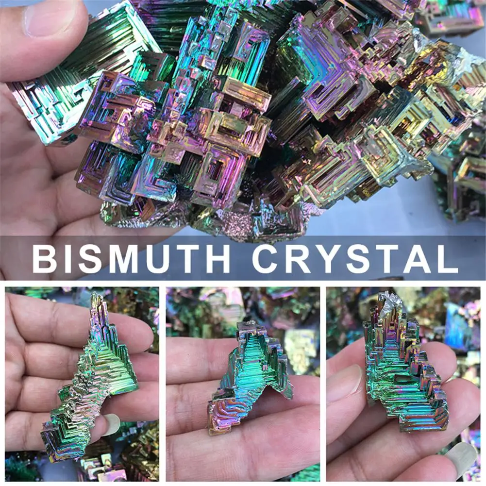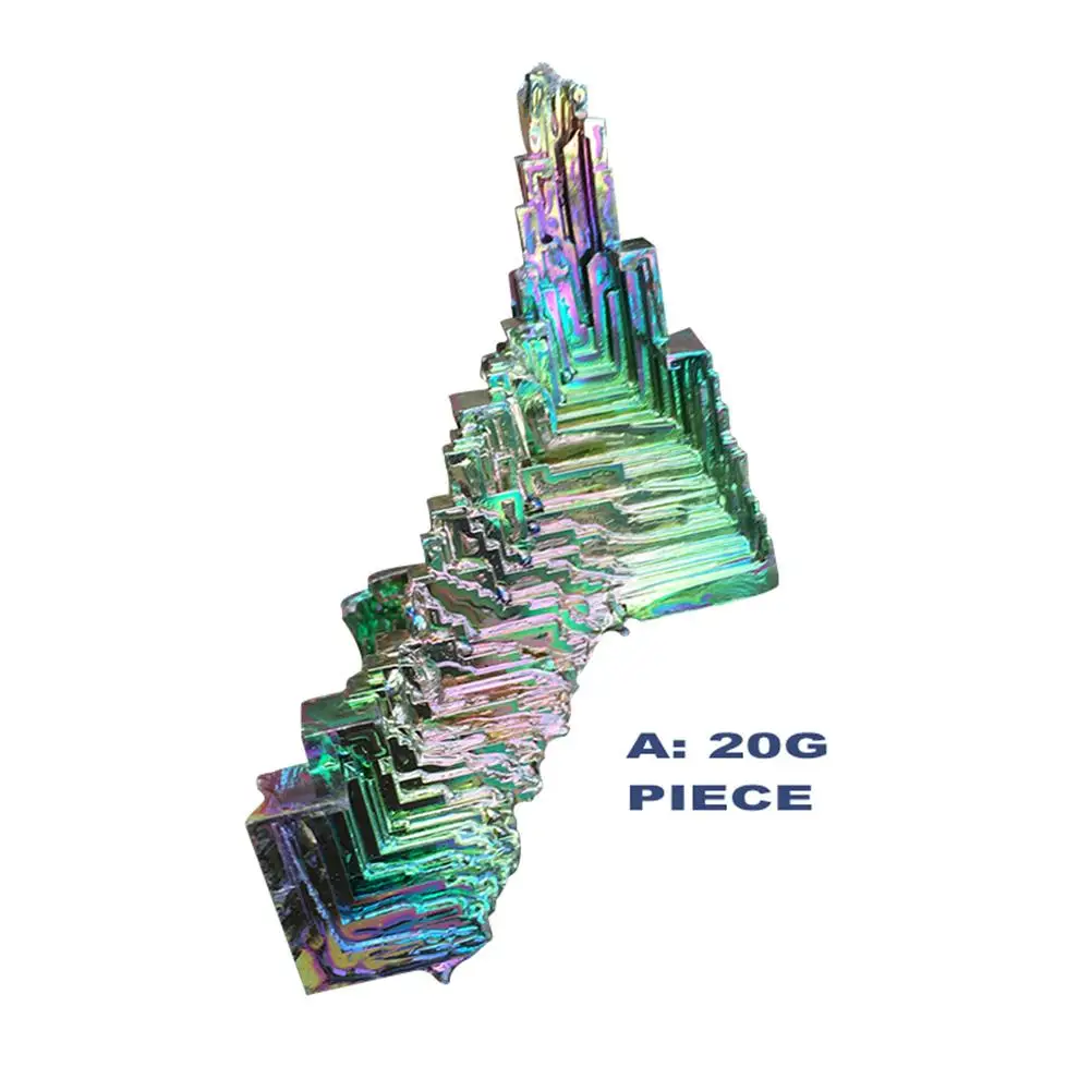 Кристаллический висмут изготовлен из плавления высокочистого бисмута металла при медленном охлаждении кристаллизации с сложной и стандартной формой. Кристаллический висмут будет окислен во время производственного процесса, в результате чего различные цвета оксидной пленки, она очень яркая!1 x Кристалл висмута