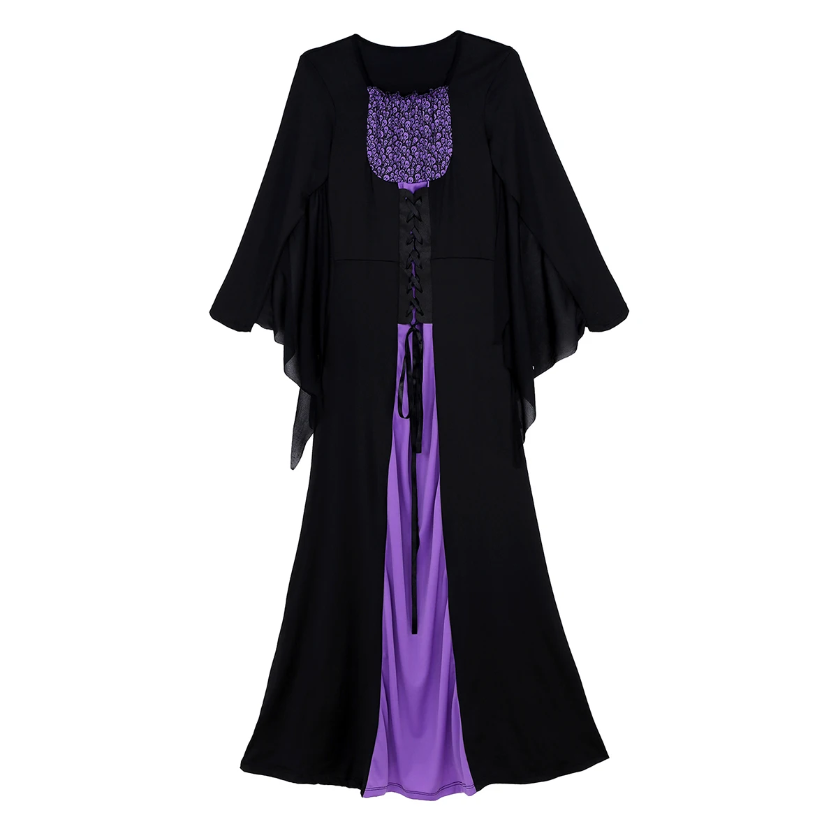 Эластичный вырез, длинные рукава с зубчатым подолом, рисунок в виде скелета на груди, длинное платье на шнуровке спереди.