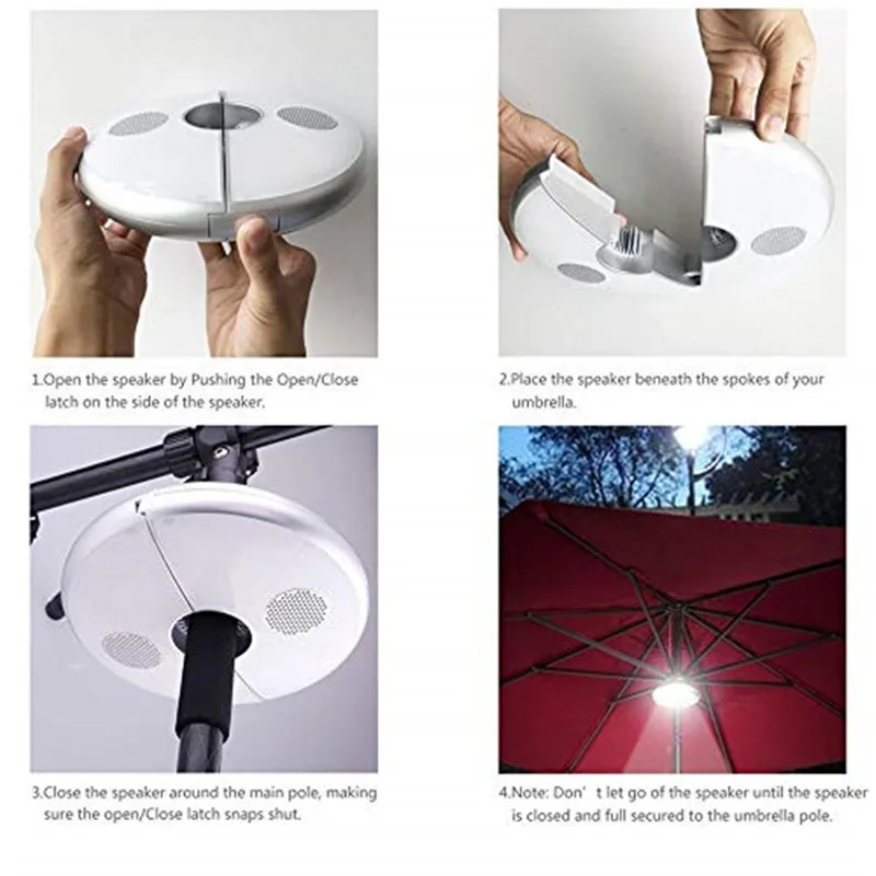 1. Удивительные музыкальные режимы: имеет встроенный двойной громкий динамик, способна воспроизводить музыку через bluetooth-соединение и изменить Светильник цвета в синхронизации, предоставляет вам хороших визуальных эффектов во время прослушивания музыки. 2. Функция Power Bank: разработан с USB выходным портом, способным заряжать ваши устройства с сохраненной мощностью, поэтому вам не нужно беспокоиться о том, что ваш мобильный телефон не будет работать на открытом воздухе. 3. Длительное время работы: оснащен литиевой батареей Емкостью 4000 мА · ч, достаточным для того, чтобы использовать зонтичный светильник в течение длительного времени, позволяет вам наслаждаться музыкой и светильник без перерыва. 4. Простота установки: включает встроенный авто-регулируемый крепкий зажим, удобно зажимает Зонт или крепится на стержень без дополнительных инструментов. Также можно повесить в любом месте, чтобы служить в качестве лампы для кемпинга с помощью крючков. 5. Портативный и прочный: высококачественный пластиковый корпус, с прочными и легкими функциями, идеально подходит для активного отдыха, например, кемпинга, пляжного барбекю, игральных карт, садовых вечеринок и т. д.