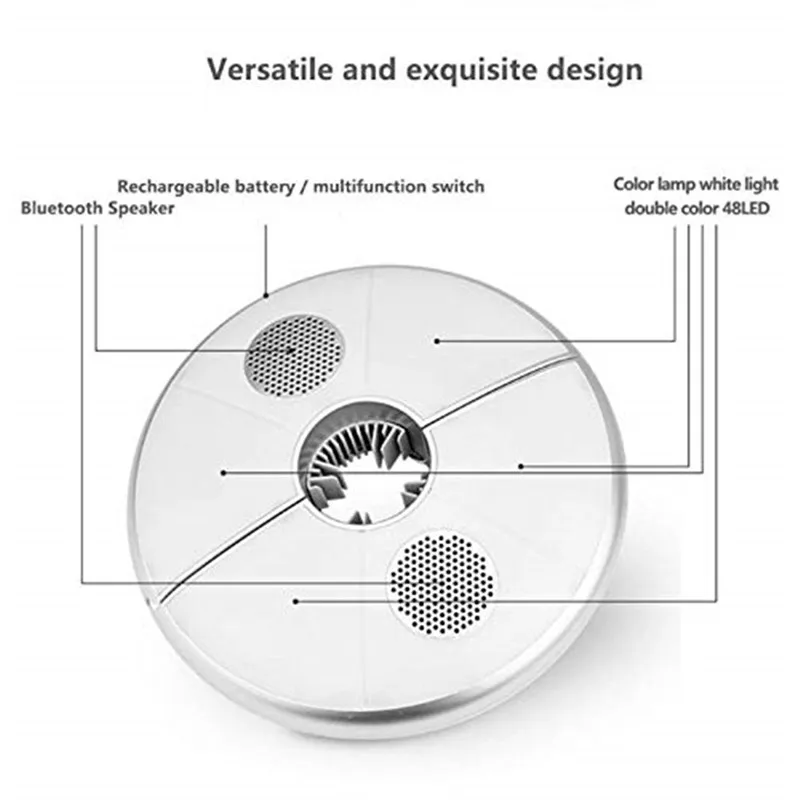 Бренд: LEDGLE Световой поток: 320 лм Входная мощность: 5 В/1 А Мощность: 12 Вт (всего)/ 2*3 Вт (динамик)/ 6 Вт (светодиодный светильник) Источник питания: зарядка через USB Время полной зарядки (приблизительно): 4 часа Время работы (прибл.): 6 часов (музыка)/ 3 часа (музыка и светильник) Батарея: 3,7 V/4000mAh литиевая батарея Светильник источник света: 48 * Светодиодный бусины Подходящий диаметр (приблизительно): 0,8 до 2 "(для детей возрастом от 2 до 5,2 см)