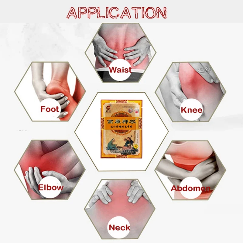 1, high percentage preparation, quick effect, long-term action 2, good biocompatibility, no allergy and skin irritation 3, suitable adhesion, paste Skin tight, does not adhere to body hair 4, good air permeability and water permeability, Avoid skin juices in long-term use 5,An anesthetic adhesive is formulated with extracts of valuable herbs. Using our unique prey and advanced technology, this patch successfully integrates medicines with physical therapy and will bring self-heating, which can alleviate all kinds of pain. 6,Quickly relieve various pain associated with fatigue of the Nuslon, muscle pain, Rigid shoulder, simple swamp, strains, sprains, bruises, broken bones, minor sprouts, arthritis. (necessary for office workers, in demand in hot weather and WAM zones) . How to Use: -Clean and dry affected area -Remove the plastic backing on one side of the stripe. -Thick that side over the area where you want pain relief. -After you remove the other half of the plastic backing, rub the rest of the patch over the pain zone. - Remove the film from the substrate and apply. -8 hours for each time, 5 times a week for the process.