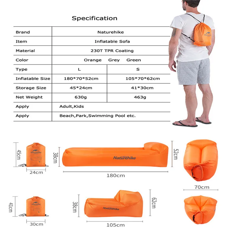 Название бренда: Naturehike Модель: NH18S030-S Материал: 230 T TPR цвет покрытия: оранжевый, серый, зеленый Размер надувной: 180*70*52 см (длина), 105*70*62 см (S) Размер хранения: 45*24 см (длина), 41*30 см (Малый) Вес нетто: 630 г (L), 463 г (ы) Применение: пляжи, парки, бассейны и т. д. Цвет: оранжевый, серый, зеленый Размер: маленький, большой пакет: диван-кровать * 1 (без надувания)