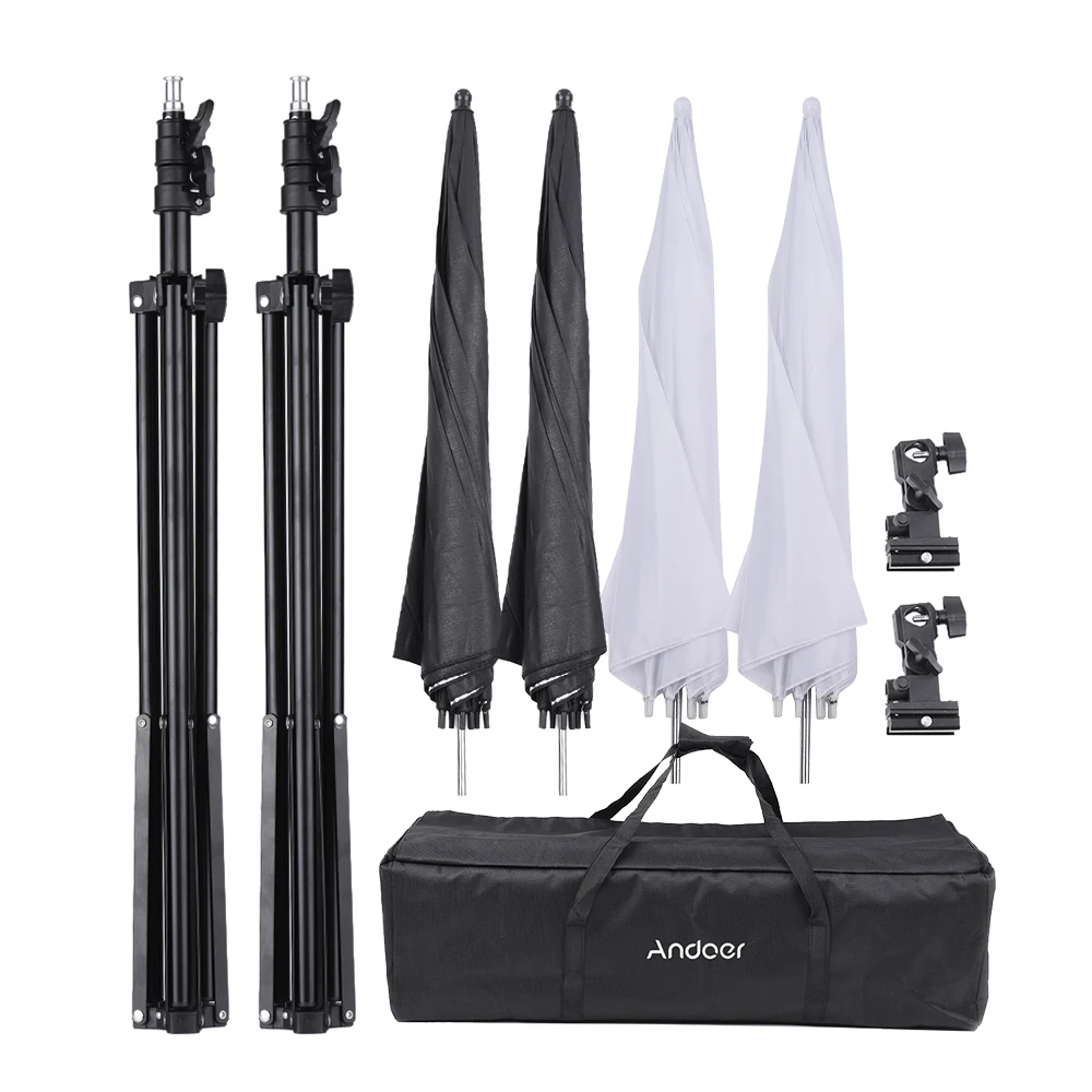 Набор для фотостудии Andoer включает в себя 2 шт. 2 м светильник, 2 шт. 83 см полупрозрачные белые зонты мягкого света, 2 шт. 83 см черные и серебряные зонты, 2 шт. скобы b-типа shoemount и 1 шт. сумка для переноски.