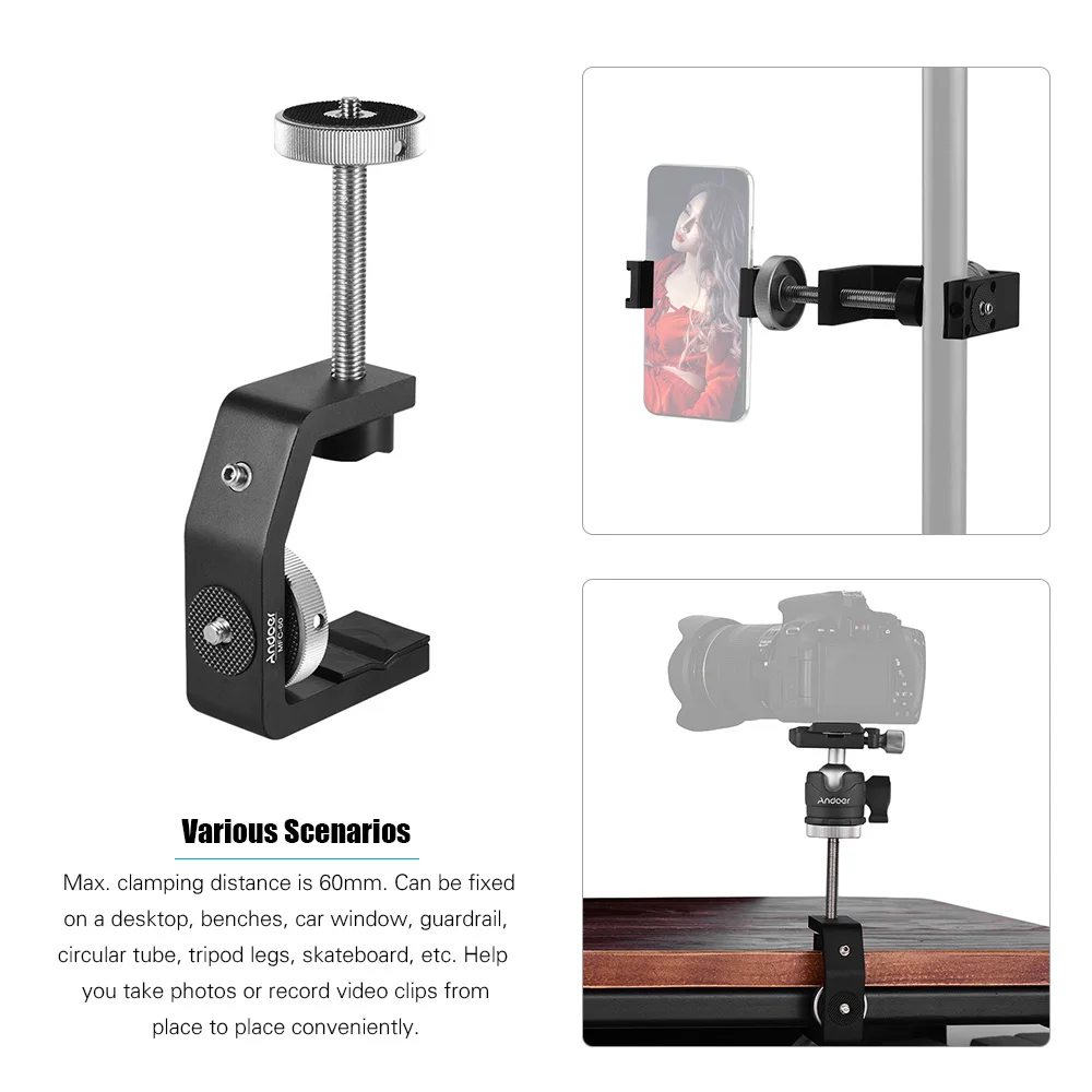 Макс. Расстояние зажима 60 мм. Может быть закреплен на рабочем столе, скамейках, автомобильном окне, ограждении, круглой трубе, ножках штатива, скейтборде и т. д. поможет вам делать фотографии или записывать видео клипы с места на место.