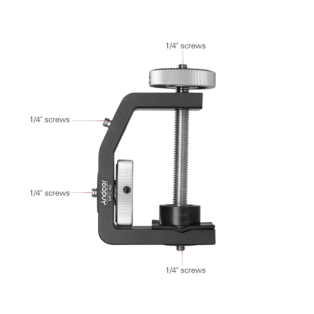Резьбовое отверстие 1/4 дюйма (1 шт.) позволяет закрепить c-образный зажим на большинстве штативов или на подставках под светильник.