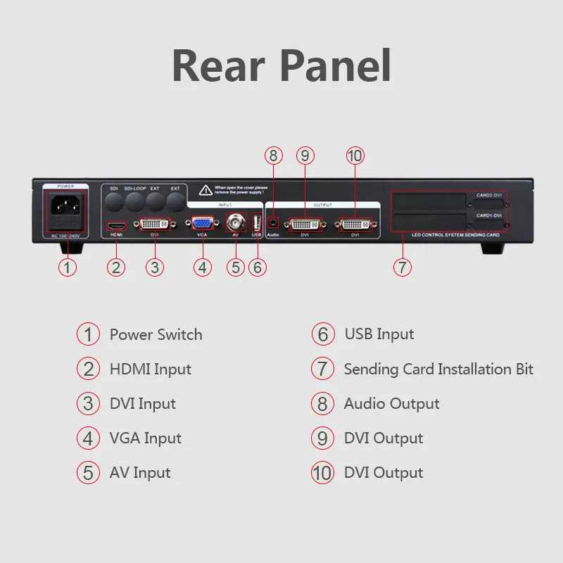 > Плавное переключение между любым каналом > Поддержка U disk play > Функция обнаружения сигнала > Максимальное разрешение выхода: 1920*1080 @ 60 Гц > 6-канальный аналогово-цифровой видео вход: 1AV 1DVI 1 HDMI 1VGA 1USB > Технология предварительного переключения > Аудио-выхода > Ручка регулировки установка > Отправка слота для карт установка ящика