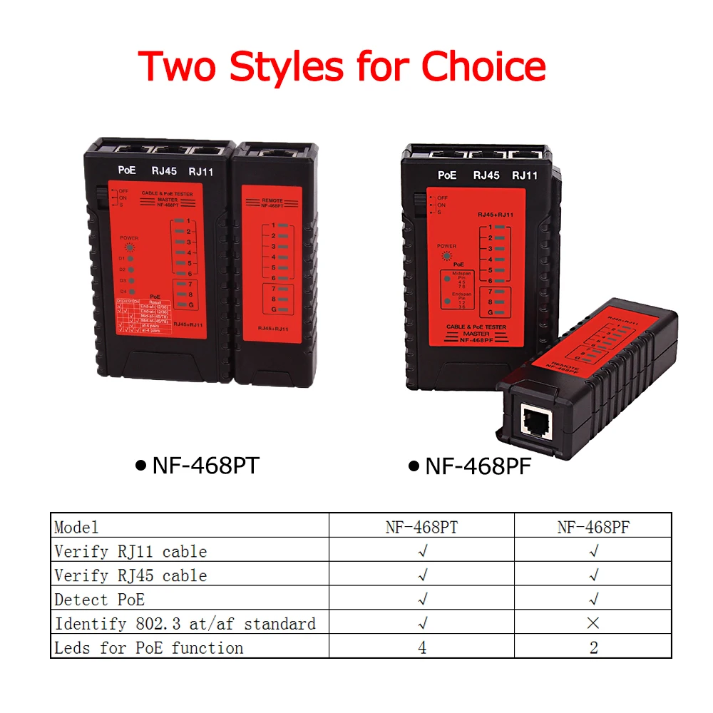 Тест RJ45, RJ11 телефонных кабелей и сетевых кабелей, и обнаружение POE быстро.