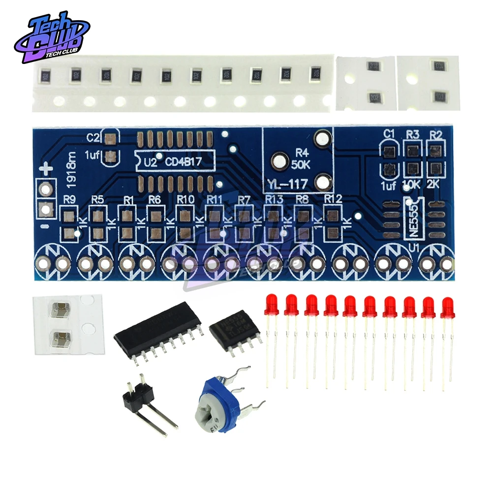 Размер платы. 53 мм * 19 мм Поставка Напряжение: 2,5-14 .5 V Эта посылка в основном является десятичной контурной схемой и схемой, генерируемой часами, от ядра самовозбуждаемого мультивибратора NE555 через R2, R3, R4 заряжайте конденсатор C1, c1 запускается при зарядке, NE555 2 фута все еще на низком уровне, поэтому выход pin 3 идет высоко, когда мощность через R2, R3, R4 для зарядки от C1 до 2/3 напряжения питания, выходной штырь 3 уровня от high до low , NE555 проводящий внутренний разряд, конденсатор C1 через R4, R3, NE555 7 футов разряда до тех пор, пока напряжение через C1 находится на расстоянии менее 1 /3 напряжение источника питания, NE555 и 3 фута от низкого до высокого. C1 и заряжайте снова, образуются колебания цикла. Время зарядки: 0,695 (R2 + R3 + R4) C1, Время разряда: 0,695 (R4 + R3) C1, R4 можно регулировать для контроля выходной частоты осциллятора, осциллирующий сигнал часов применяется непрерывно NE555 CD4017 14 футов, Выходной терминал 10 соединен с CD4017 10 светодиодный, когда выходной терминал 10 поворачивает CD4017 генерируемый сигнал часов применяется на высоком уровне, d1-D10 последовательно горит, чтобы создать эффект водного светильник. Вы можете настроить скорость потока R4 светодиодный свет Pacakge включает в себя: 1 * NE555 + CD4017 светильник проточный светильник светодиодный модуль DIY Kit