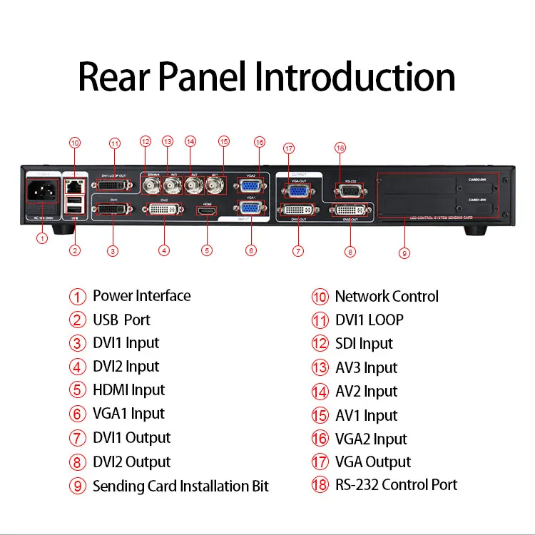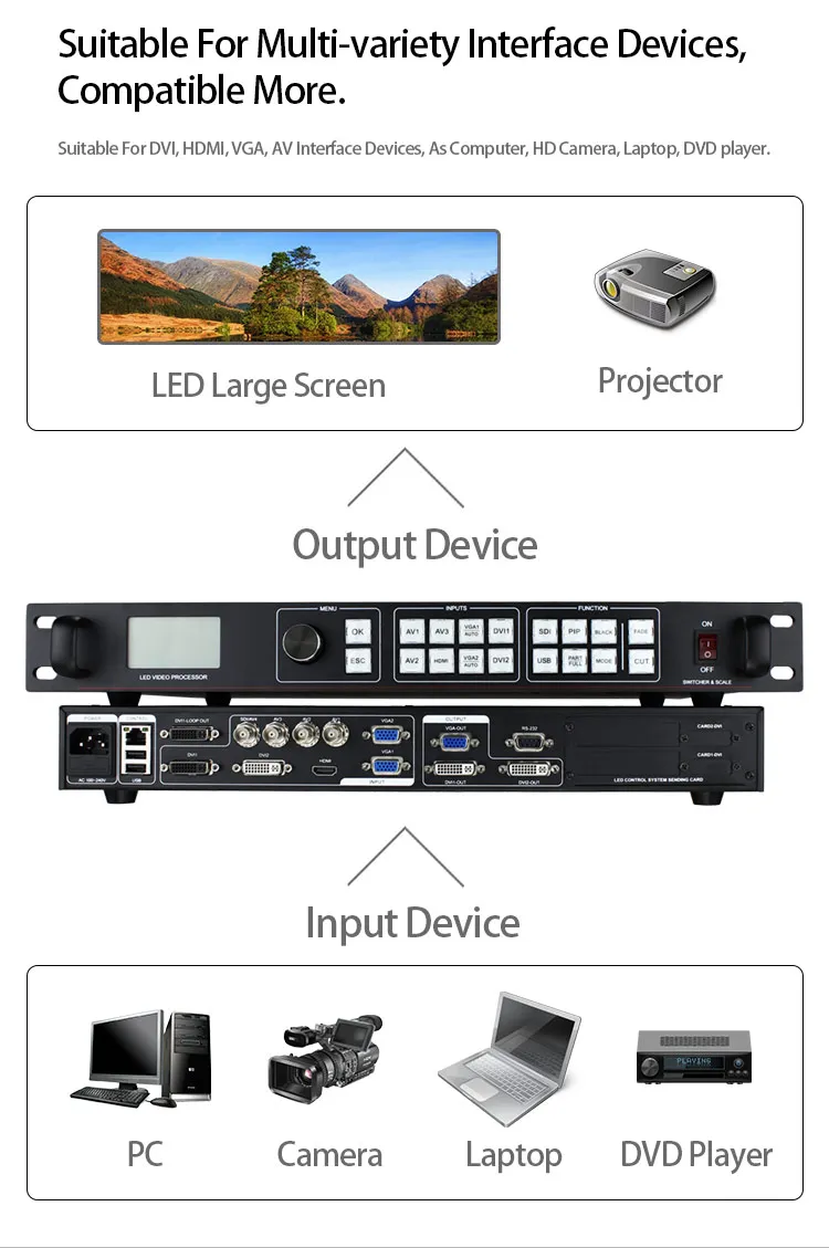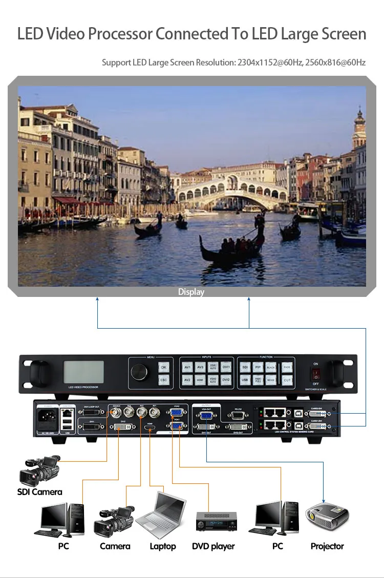 > Плавное переключение между любым каналом > Один ключ черный экран и замораживание > Поддержка большого соединения 10x10 > Цвет матирующий функция > 34 показаны эффекты произвольного переключения > Максимальное выходное разрешение: 3840*640 @ 60Hz 2304*1152 @ 60Hz 2560*816 @ 60Hz > 9-канальный цифровой-аналоговый Видеовход: 2AV 2DVI 1HDMI 2VGA 1USB 1SDI > Технология предварительного переключения > 16 Тестовые образцы > Функция PIP, функция P0P > Предустановленное сохранение и отзыв