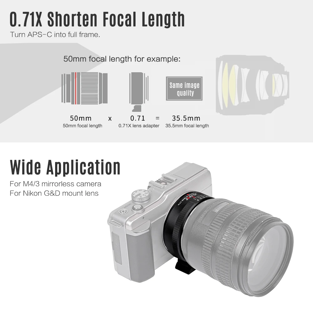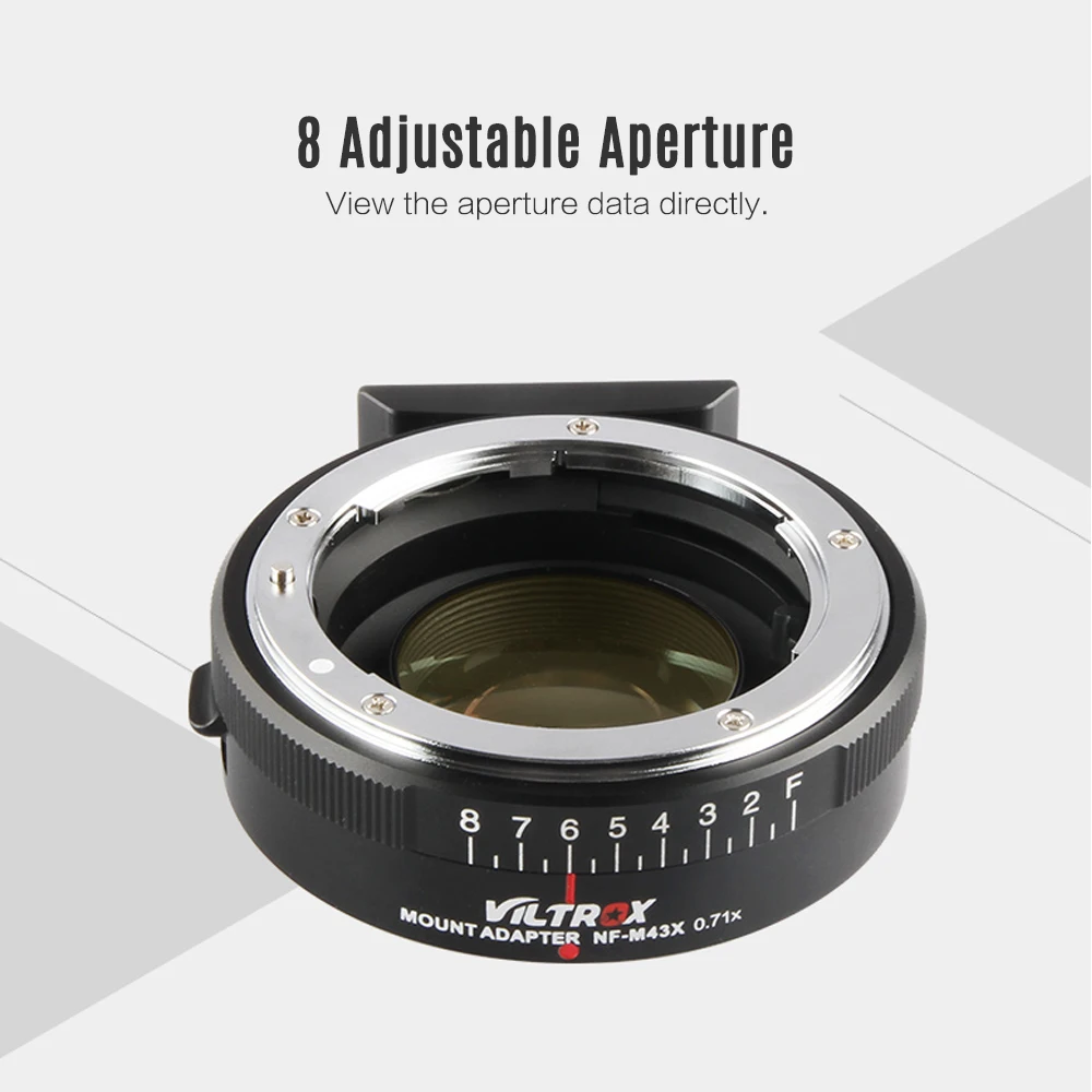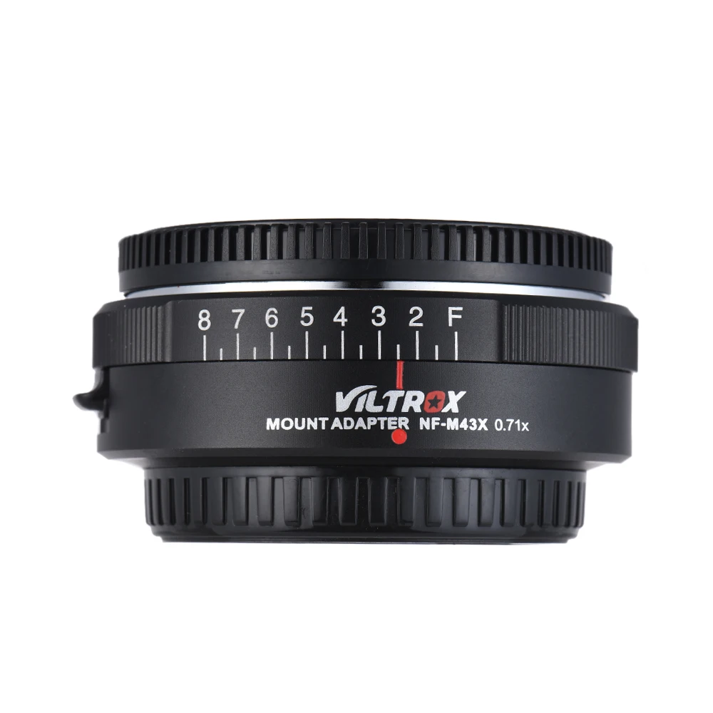 Адаптер объектива Viltrox NF-M43X предназначен для камеры M4/3 для Nikon G & D. Шкала диафрагмы 8 класса, мультипликатор фокусного расстояния 0,71x. Он имеет больший светильник с высоким коэффициентом пропускания, таким образом, вы могли бы лучше разлив нефти основного предмета.