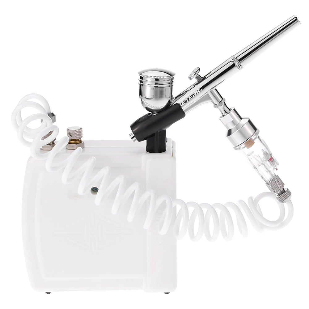 Включает в себя портативный воздушный компрессор, воздушный шланг, Аэрограф Двойного действия, мини-фильтр для очищения воздуха, держатель, насадка гаечный ключ и капельница для глаз.