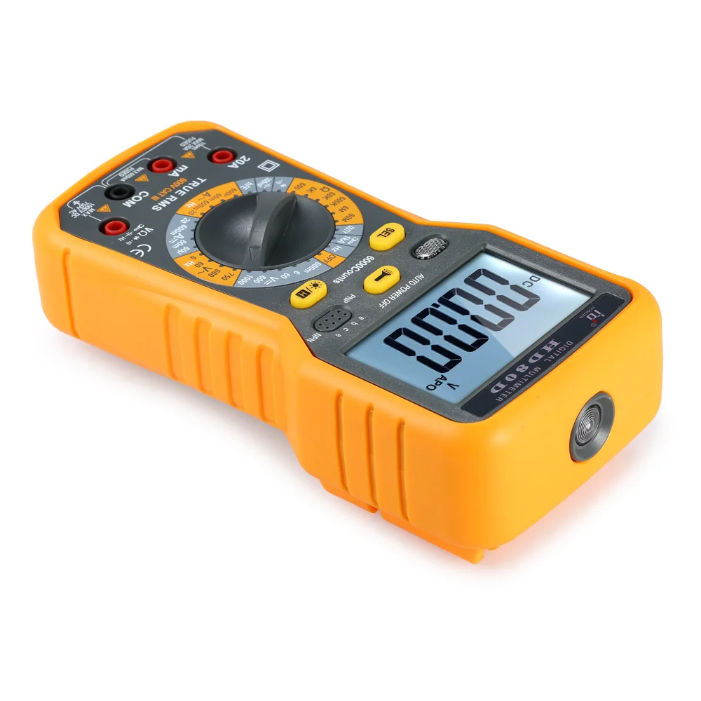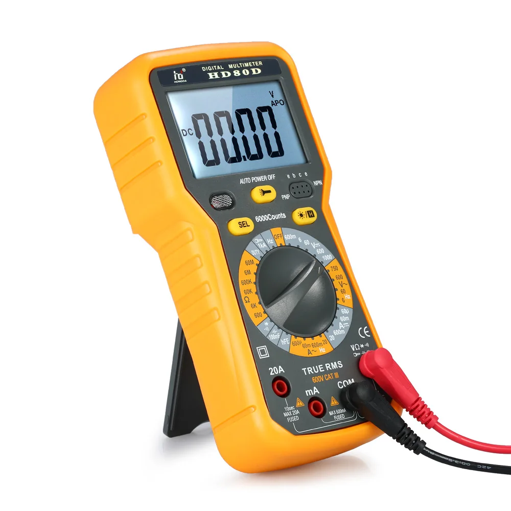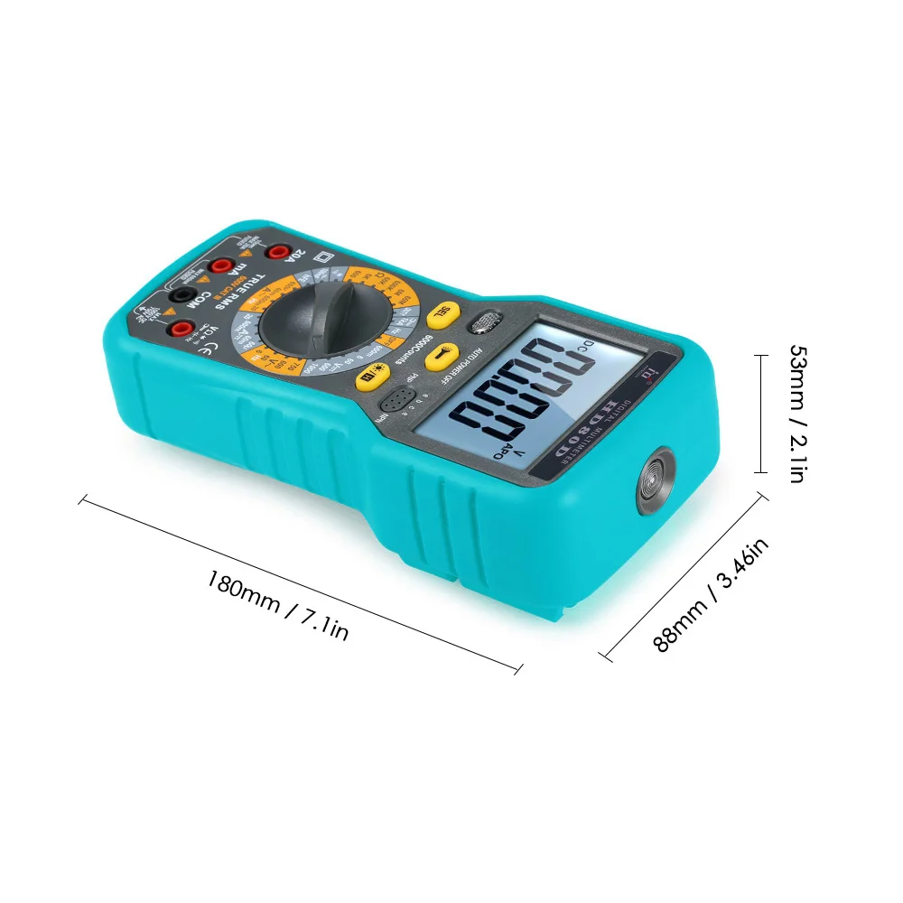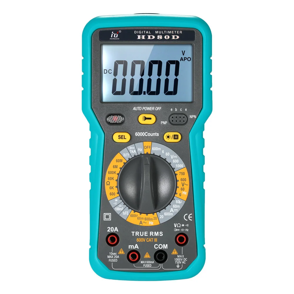 Этот цифровой мультиметр с дисплеем 6000 отсчетов, принимает новейший дизайн программного обеспечения для автоматической калибровки, высокой точности и хорошей стабильности. Он оснащен большим ЖК-дисплеем с подсветкой, мягким защитным чехлом, функцией фонарика и т. д. Может использоваться для измерения постоянного/переменного напряжения/тока, сопротивления, емкости, частоты, рабочего цикла, диода, триода, непрерывности и переменного тока (ввод зажима).