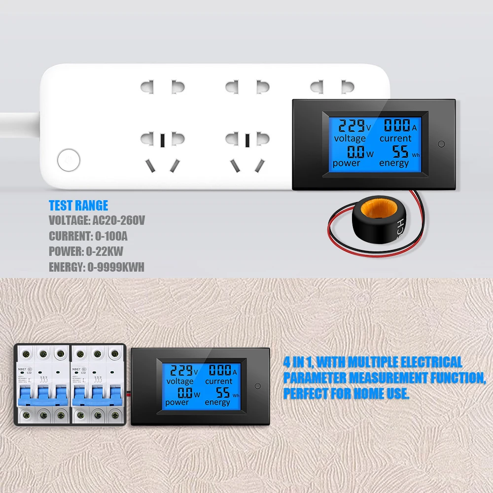 Этот счетчик может использоваться только с однофазной мощностью переменного тока. И он может измерять только активное питание. Храните данные о энергии при выключении питания, кнопка доступна для управления. Также с функцией сигнализации от перегрузки, подсветка и питание будут мигать при превышении заданного значения.