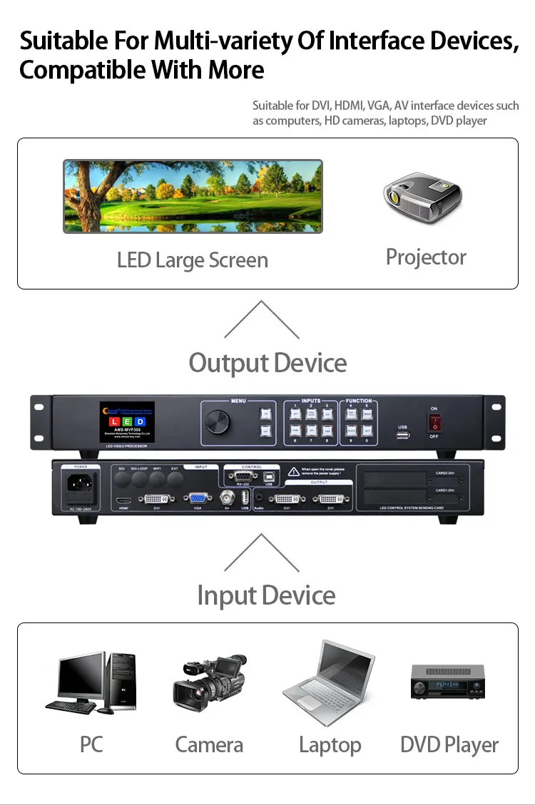 Полновыходное разрешение-светодиодный видеопроцессор предназначен для пользователей с удобным выходным разрешением, максимально достигающим 1920 точек, самым высоким из 1080 точек, для различных точечных матричных дисплеев. Различные виды разрешения на выходе для пользователей на выбор и могут быть настроены на точечный выход. Технология предварительного переключения-технология предварительного переключения, переключение входного сигнала переключается для предсказания заранее ли входной сигнал канала. Эта функция уменьшает отключение линии или может быть из-за того, что чехол без входного сигнала для переключения непосредственно приводит к ошибкам, улучшает показатели успеха.
