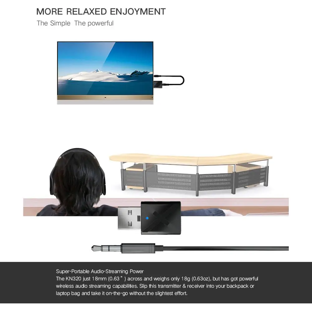 6. KN320 всего 32 мм (1,26 '') поперек и весит всего 3,2 г (0,11 унций), но имеет мощные беспроводные возможности потоковой передачи аудио. Вставьте этот передатчик и приемник в рюкзак или сумку для ноутбука и возьмите его на ходу без каких-либо усилий.