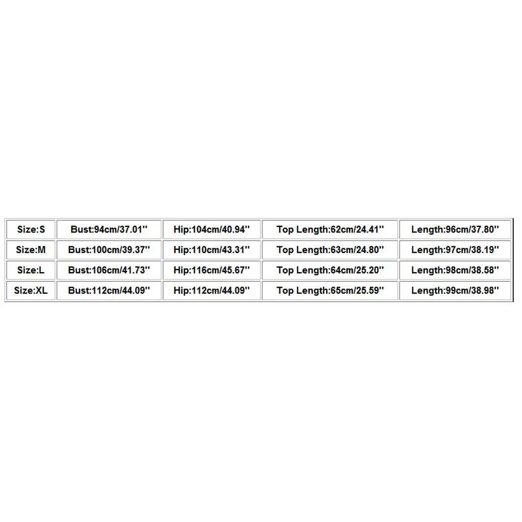 Размер: S Обхват груди: 94 см/37,01 дюйма Обхват бедер: 104 см/40,94 дюйма Длина верха: 62 см/24,41 дюйма Длина: 96 см/37,80'' Размер: M Обхват груди: 100 см/39,37 дюйма Обхват бедер: 110 см/43,31 дюйма Длина верха: 63 см/24,80 дюйма Длина: 97 см/38,19 дюйма Размер: L Обхват груди: 106 см/41,73 дюйма Обхват бедер: 116 см/45,67 дюйма Длина верха: 64 см/25,20 дюйма Длина: 98 см/38,58'' Размер: XL Обхват груди: 112 см/44,09 дюйма Обхват бедер: 112 см/44,09 дюйма Длина верха: 65 см/25,59 дюйма Длина: 99 см/38,98''