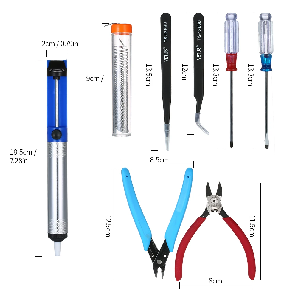 Комплект паяльника может удовлетворить все ваши потребности в паяльной работе со всеми фитингами, паяльником, цифровым мультиметром, насосом для распайки, пинцетом, Оловянным проводом, паяльником, железным наконечником, плоскогубцами, мини-проводом для зачистки, делает пайку более легкой и удобной.