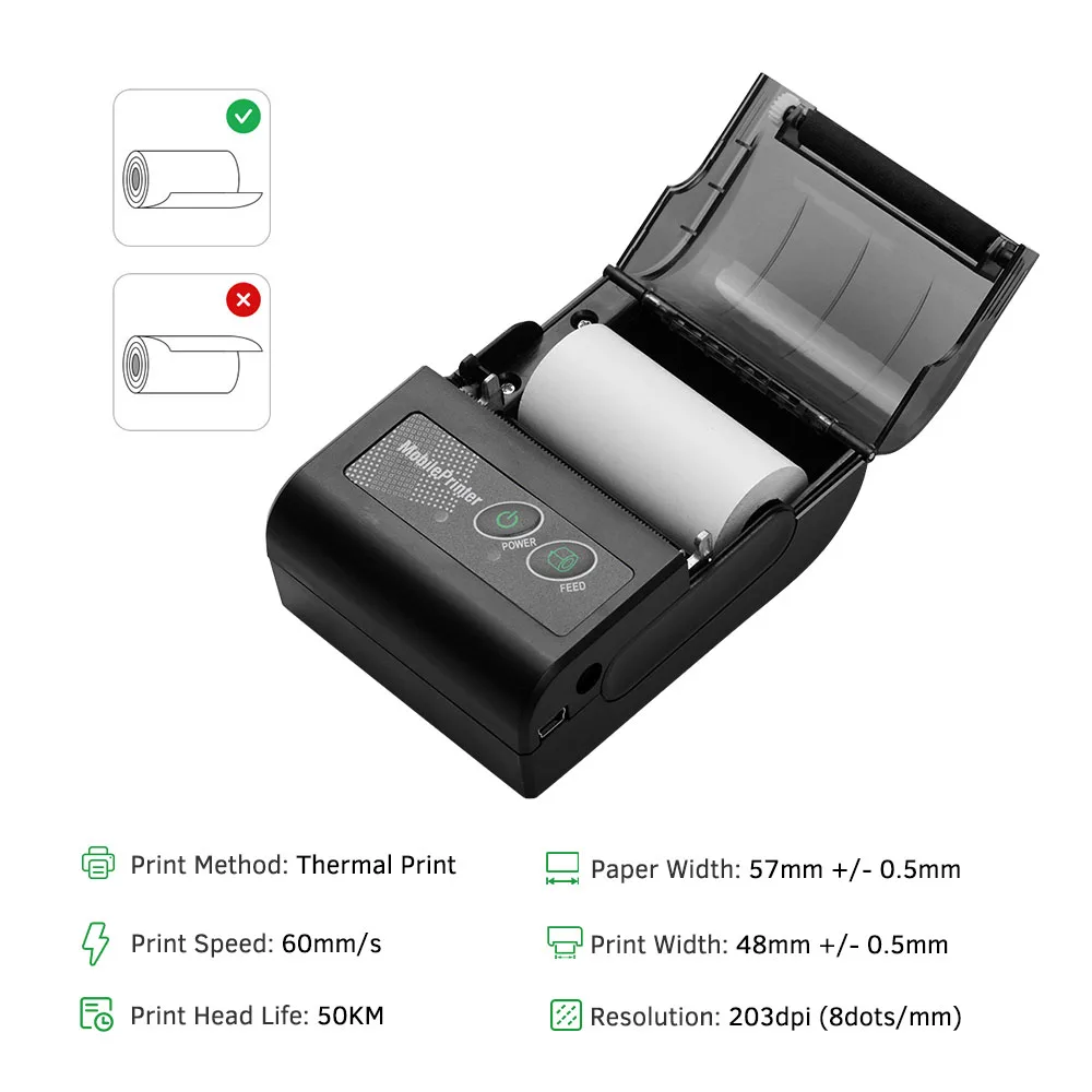 58 мм ширина бумаги, 48 мм Эффективная ширина печати, поддержка принтера 203 точек/дюйм (8 точек/мм) разрешение.