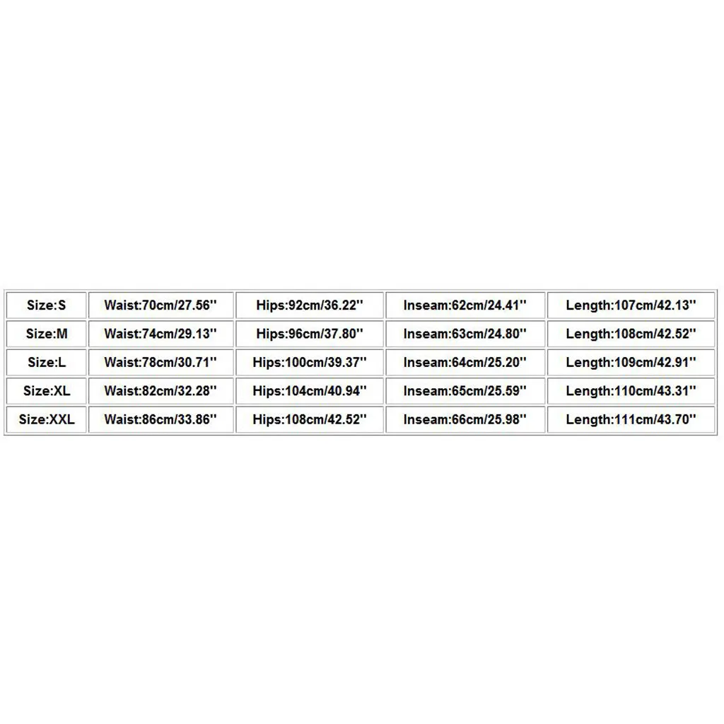 Размер: SТалия: 70 см/27,56 дюймаБедра: 92 см/36,22 дюймаВнутренний шов: 62 см/24,41 дюймаДлина: 107 см/42,13 дюймаРазмер: MТалия: 74 см/29,13 дюймаБедра: 96 см/37,80 дюймаВнутренний шов: 63 см/24,80 дюймаДлина: 108 см/42,52''Размер: LТалия: 78 см/30,71 дюймаБедра: 100 см/39,37 дюймаВнутренний шов: 64 см/25,20 дюймаДлина: 109 см/42,91 дюймаРазмер: XLТалия: 82 см/32,28 дюймаБедра: 104 см/40,94 дюймаВнутренний шов: 65 см/25,59 дюймаДлина: 110 см/43,31''Размер: XXLТалия: 86 см/33,86 дюймаОбхват бедер: 108 см/42,52 дюймаВнутренний шов: 66 см/25,98 дюймаДлина: 111 см/43,70''