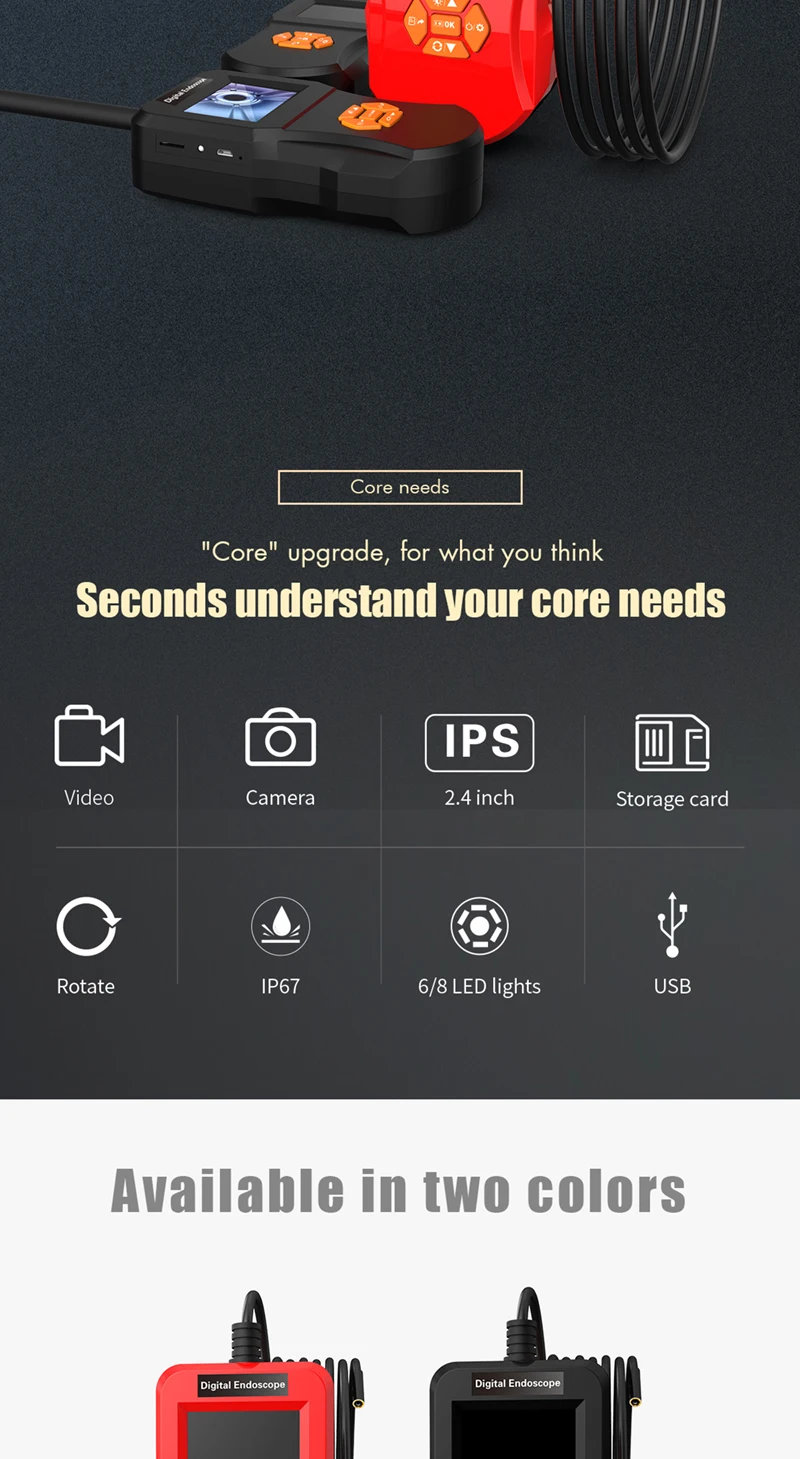 Разрешение: 640*480P Сенсор пикселей: 0,3 миллионов Время работы: около 90 минут Фокусное расстояние: 3-500 см Светильник: 6 / 8 Светодиодный светильник s Уровень водонепроницаемости: IP67 (только для объектива) Емкость аккумулятора: 800 мАч Формат изображения: JPG Формат видео: AVI