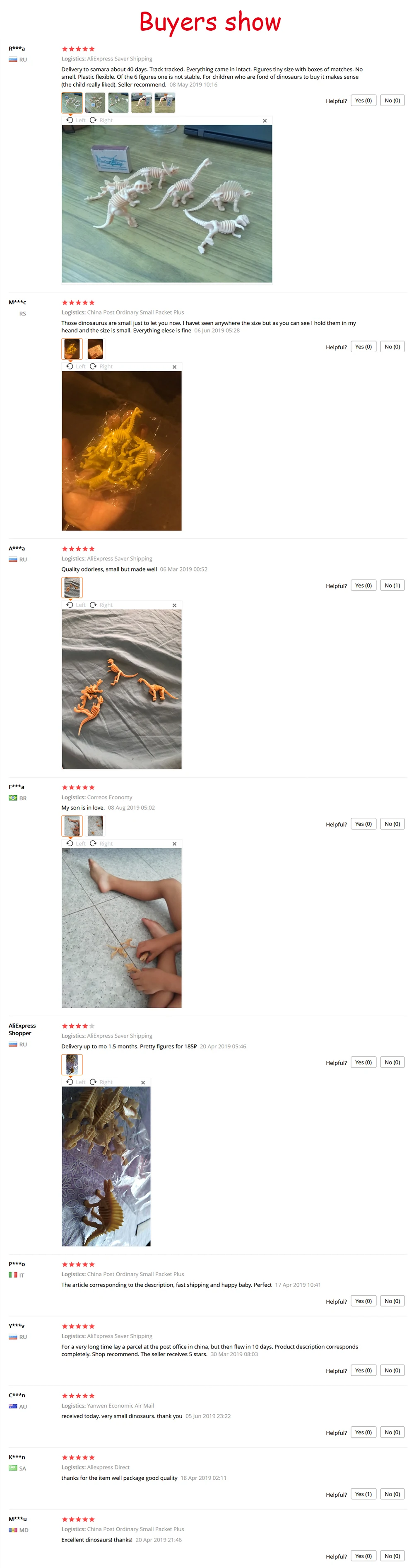 Название: модель скелета динозавра Материал: пластик Параметры: 7*5 см Вес: 36 г Количество: 6 шт. в комплекте Подходящий возраст: 3 года или старше Описание: Динозавр, который когда-то владел глобальной наземной экосистемой более 160 миллионов лет. Динозавры впервые появились в триассийском период 230 миллионов лет назад, и они вымерли в конце мелового вымирания в позднем меловом период около 65 миллионов лет назад. Динозавр, английское имя для динозавров, происходит от греческого deinos (означает ужас) Saurosc (означает ящерицы или рептилии). Этот продукт содержит: Стегозавр, трицератопс, Раптор, Брахиозавр, тираннозавр рекс, длинный спинозавр Примечание: 1. Допускается погрешность в 1-2 см из-за ручного измерения. 2. Из-за разницы между различными дисплеями изображение может не отражать фактический цвет проекта. 3. Этот продукт не имеет коробки, мы используем opp пакет упаковки