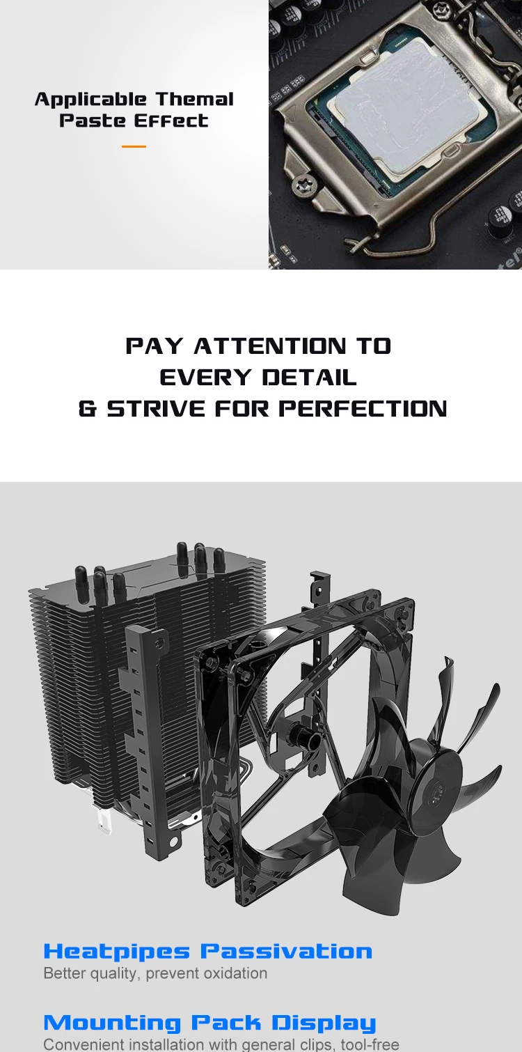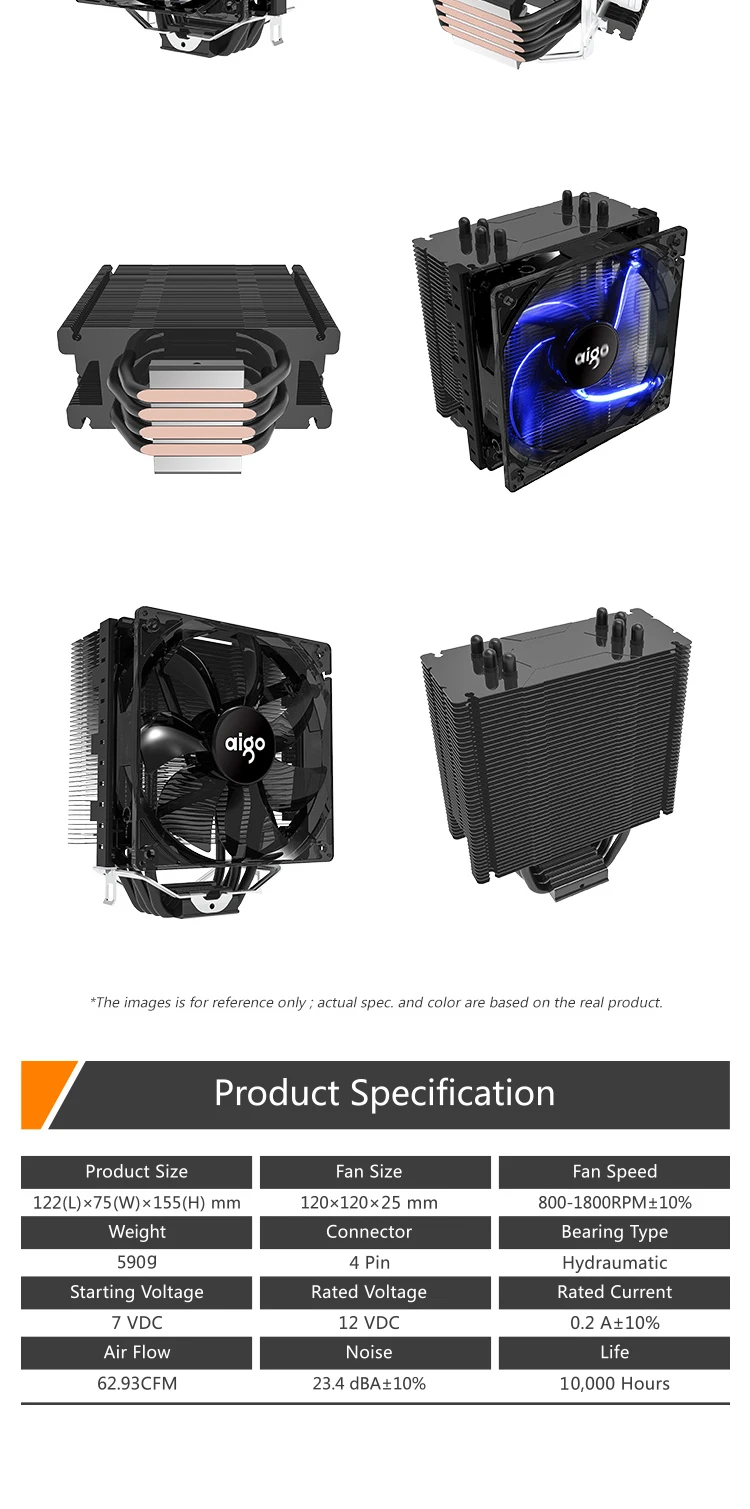 Aigo L-4 Спецификация: 1: Размер продукта: 122 (Д) * 75 (Ш) * 155 (В) мм 2: Размер вентилятора: 120*120*25 мм 3: Скорость вращения вентилятора: 500-1800 об/мин 4: разъем вентилятора: 4pin PWM 5: шум: 25.25.0dba (макс.) 6: максимальный объем воздуха: 69,36 cfm (макс) 7: давление: 2.08mmH2O (макс.) 8: подшипник: долговечный подшипник 9: напряжение: 12 В постоянного тока 10: Срок службы: 40000 часов 11: Номинальная мощность: 3,36 Вт 12: количество труб: 4 13: материал трубы: медный проводник, Отделка выпечки 14: материал теплового радиатора: Алюминиевый плавник/Отделка выпечки 15: Совместимость: Intel LGA775/1151/1150/1155/1156/1366 AMD