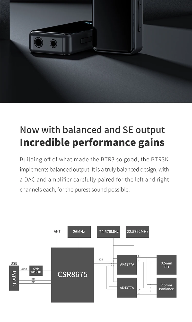 -Невероятная производительность-теперь с сбалансированным и SE выходом-надежный, полноценный звук Высокая производительность AK4377A DACs-независимые двойные кристаллические осцилляторы для точного воспроизведения звука-адаптируется к различным видам проводных наушников-флагманские способности Bluetooth Qualcomm CSR8675-быстрый и удобный регулятор громкости-Can регулируется независимо от громкости телефона