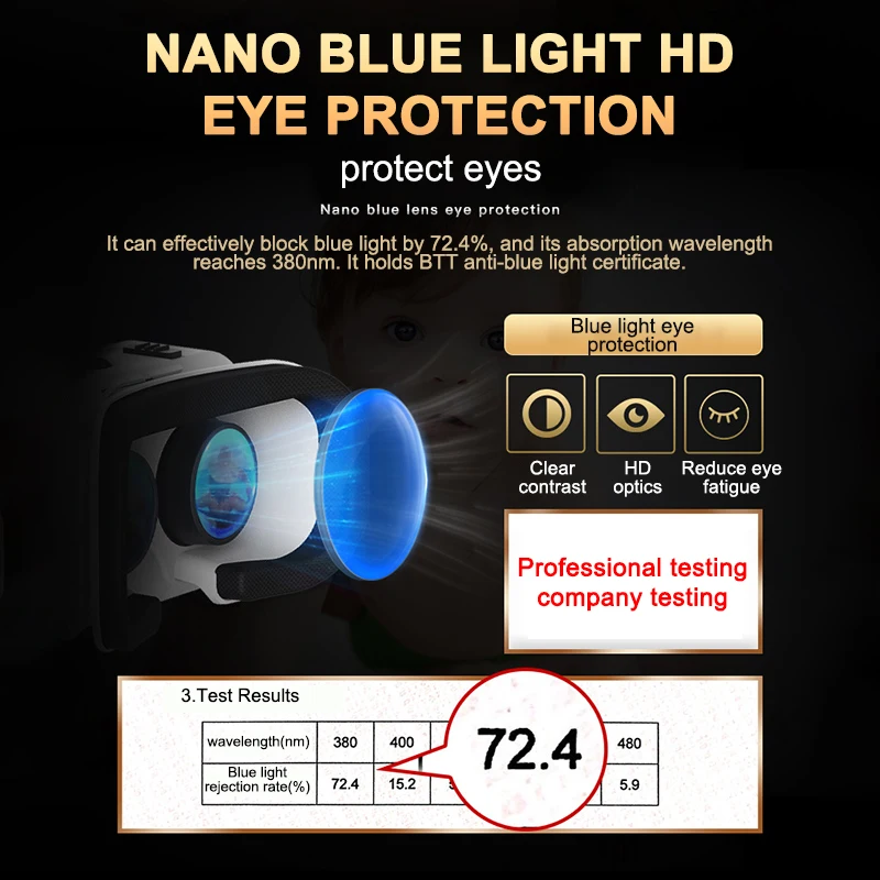 В очки виртуальной реальности VR очки может защитить глаза от 72.4% синий светильник эффективно. Весь впитывается длина волны до 380nm.