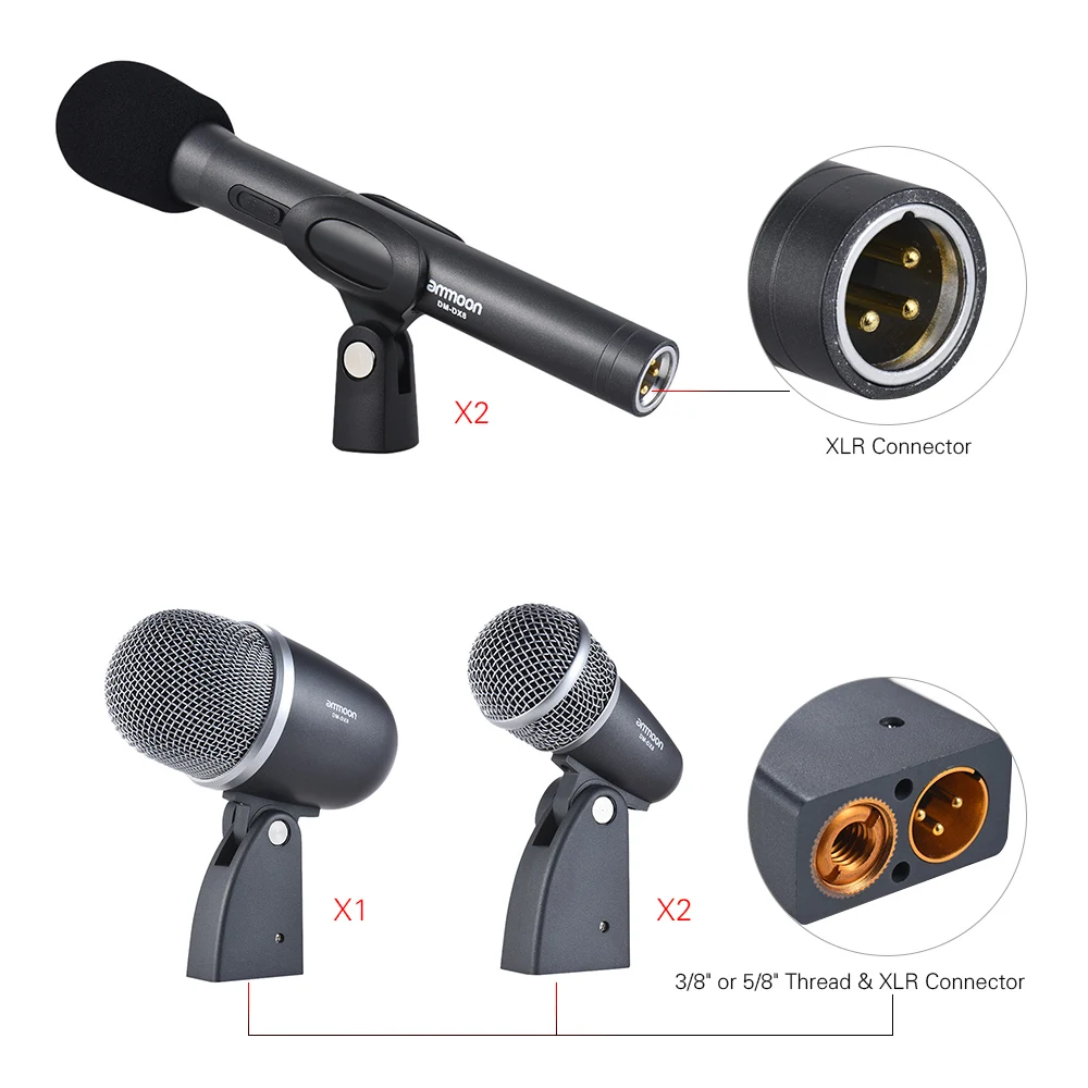 Каждый микрофон разработан со стандартной резьбой 3/8 "и 5/8", чтобы соответствовать различным типам микрофонные стойки, а также с креплениями барабана для крепления микрофона к барабанным ободам.