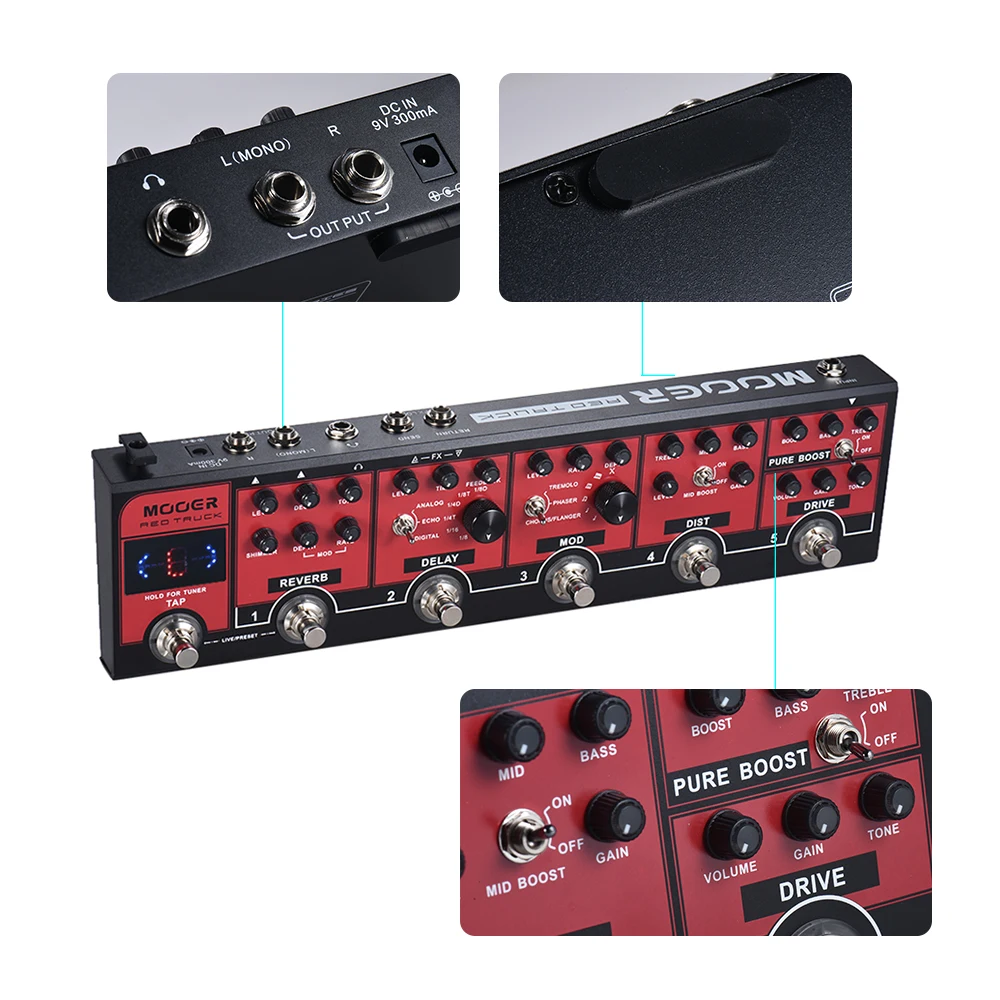 6 эффектов, встроенных в 1 простой Педальный блок: Boost + Overdrive + differation + moduation + Delay + Reverb, и с полнофункциональными элементами управления для каждого эффекта.