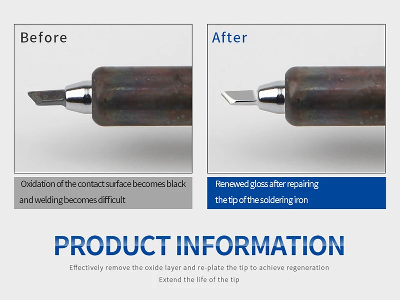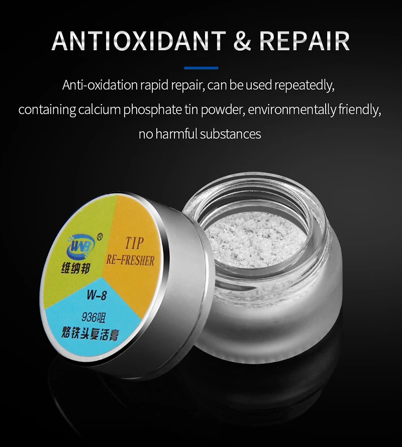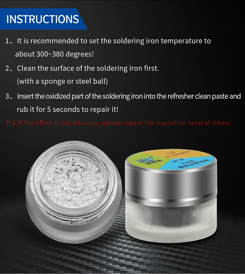 Что такое "паяльник наконечник освежающий Чистая паста"? Когда поверхность наконечника начинает окисляться во время работы, она становится темной и не мочится должным образом. Чтобы повысить эффективность работы, вам нужен этот продукт, чтобы вытереть черный оксид на поверхности наконечников паяльника, чтобы паяльник снова выглядел как новый. Почему для удаления оксидных слоев Используйте «паяльник» для очистки пасты? 1. Эффективное удаление оксидного слоя. 2. Повреждения небольшие. 3. Защитный слой из сплава с железной головкой. 4. Простой и удобный. Инструкция: 1. Когда температура наконечника составляет 300-360 ℃, выполняется регенеративная операция. 2. Поместите наконечник паяльника в мазь для воскресения, дайте паяльнику и крему для воскресения повторно втирать в течение нескольких секунд. 3. Очистите наконечник губка для припоя или медной проволоки. 4. Покрытый новым слоем паяльной проволоки, наконечник паяльника может быть чистым и новым. * Если эффект регенерации не очевиден, повторите шаги 3-4 раза до достижения желаемого эффекта, а затем нанесите новый слой припоя. Меры предосторожности: 1. Использовать только с адекватной вентиляцией. 2. «паяльник» содержит органический растворитель. Избегайте повторного контакта с кожей. Если паяльная паста попадет на вашу кожу, тщательно протрите ее спиртом и краску водой. 3. Чтобы быть осторожным, в операции следует избегать дыма, выделяемого растворителем во время операции, как можно больше, И не следует связываться с тканями кожи и слизистой оболочки слишком долго. Избегайте повторного дыхания пара. 4. Избегайте контакта с глазами. 5. Держите подальше от детей.