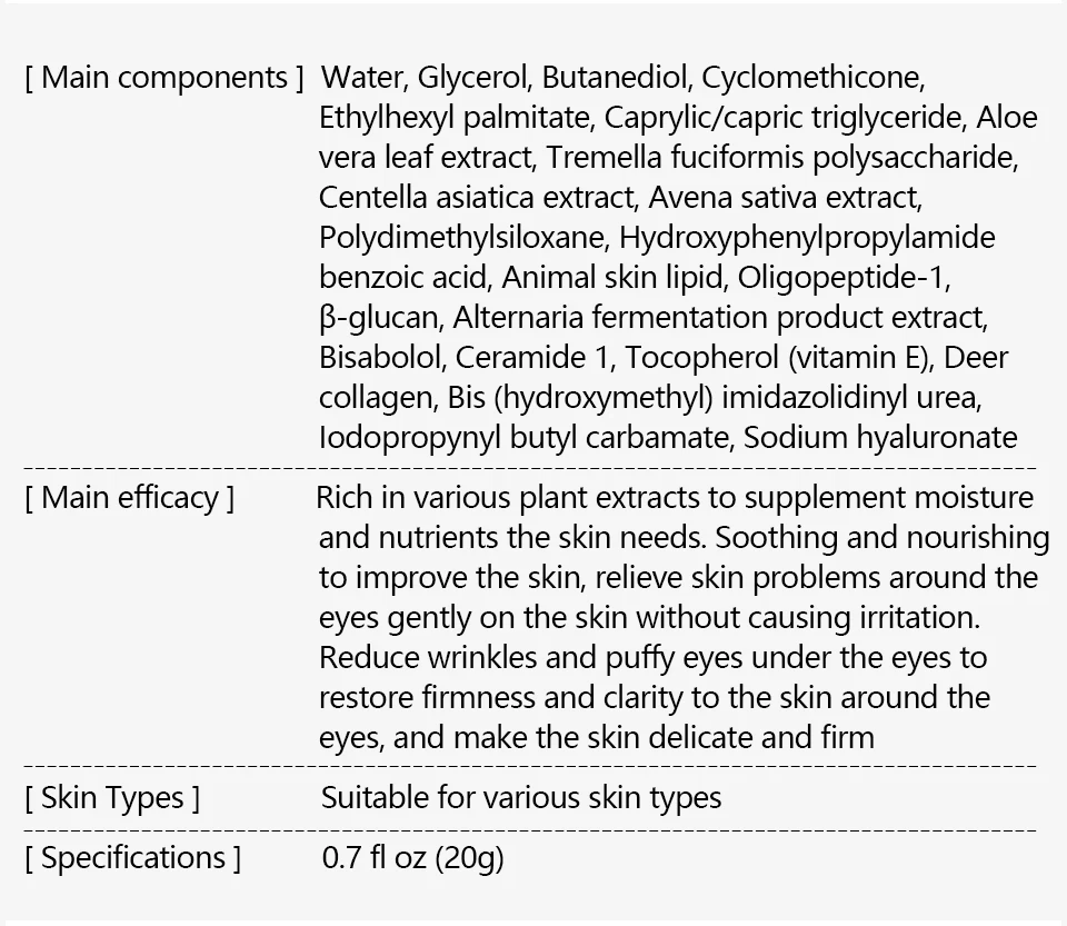 [Основные компоненты] вода, глицерин, бутандиол, циклометикон, этилгексил пальмитат, каприлия/каприц триглицерид, экстракт листьев алоэвера, экстракт трамеллы фуцифориса полисахарид, центазиелла гидроксифенилпропиламибензойная кислота, липид кожи животных, Oligopeptide-1,ß-глюкан, экстракт продуктов ферментации альтернарии, бисаболол, керамид 1, токоферол (витамин), деерколлаген лодопропинил бутилкарбамат, гиалуронат натрия [Основная эффективность] богаты различными растительными экстрактами для добавления влаги и питательных веществ для кожи. Успокаивает и питает, чтобы улучшить кожу, снимает проблемы с кожей вокруг глаз мягко на коже, не вызывая раздражения. Уменьшает морщины и пышные глаза под глазами, придает коже упругость и четкость вокруг глаз, делает кожу нежной и упругой [Типы кожи]. Подходит для различных типов кожи Спецификации: флакон 0,7 унций (20 г)