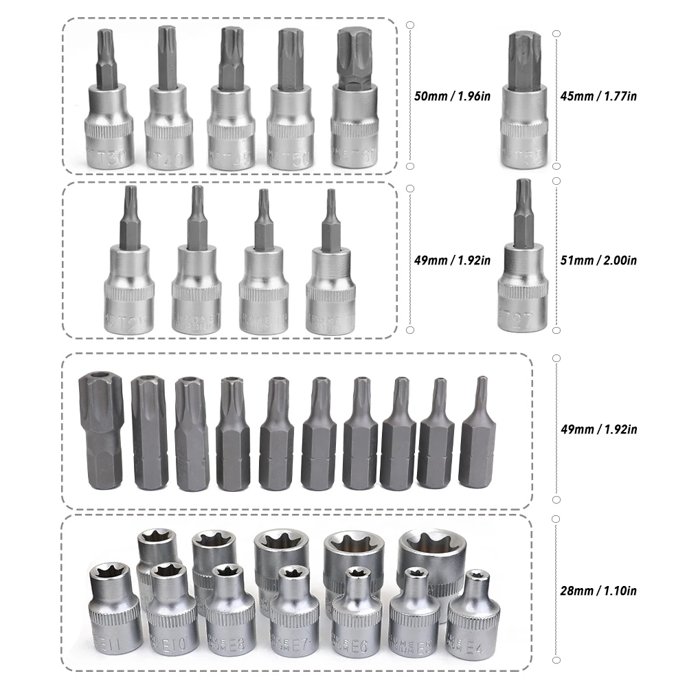 Это 34 шт. хромированная ванадиевая сталь, высокопрочные хромированные ванадиевые стальные розетки обеспечивают превосходный крутящий момент для большей мощности поворота с зеркальной хромированной отделкой для коррозионной стойкости
