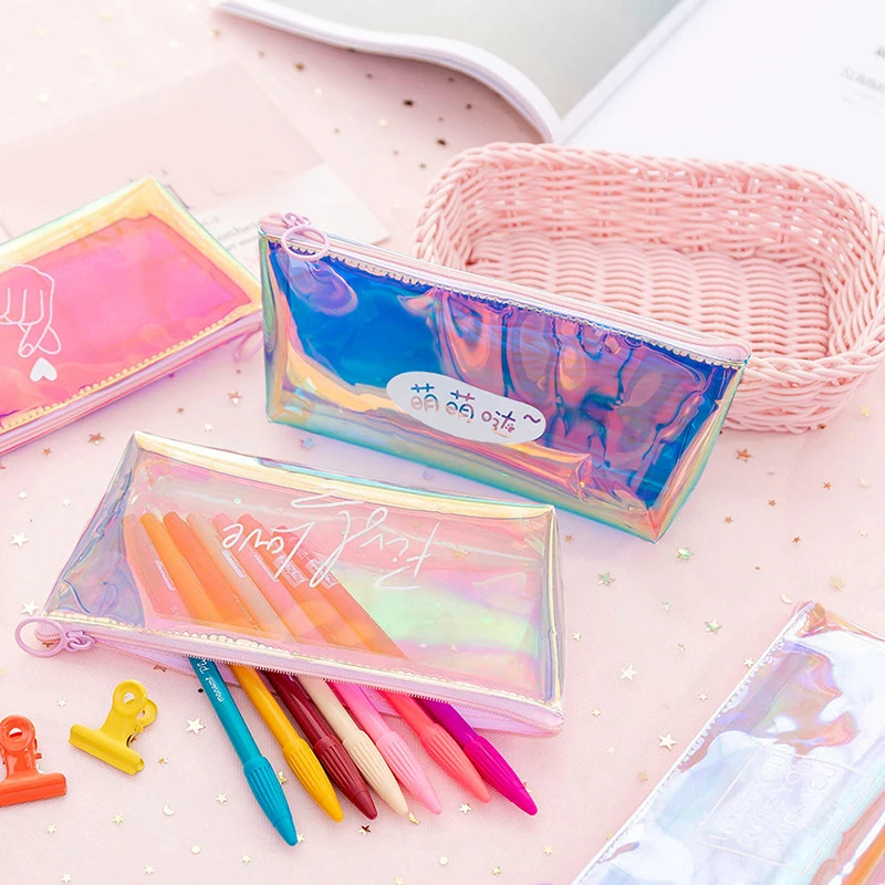 Fashion Laser Colorful Transparent Pencil Bag Box School Student Pencil Case