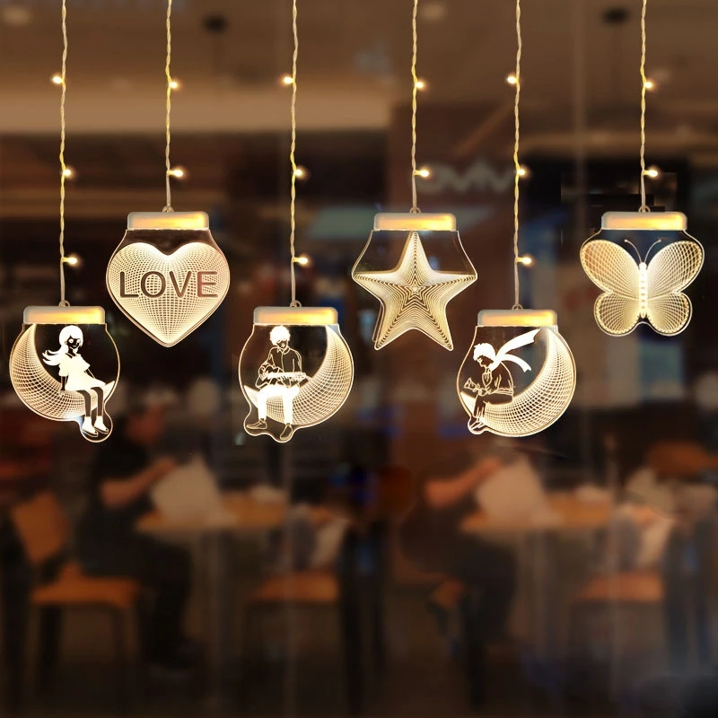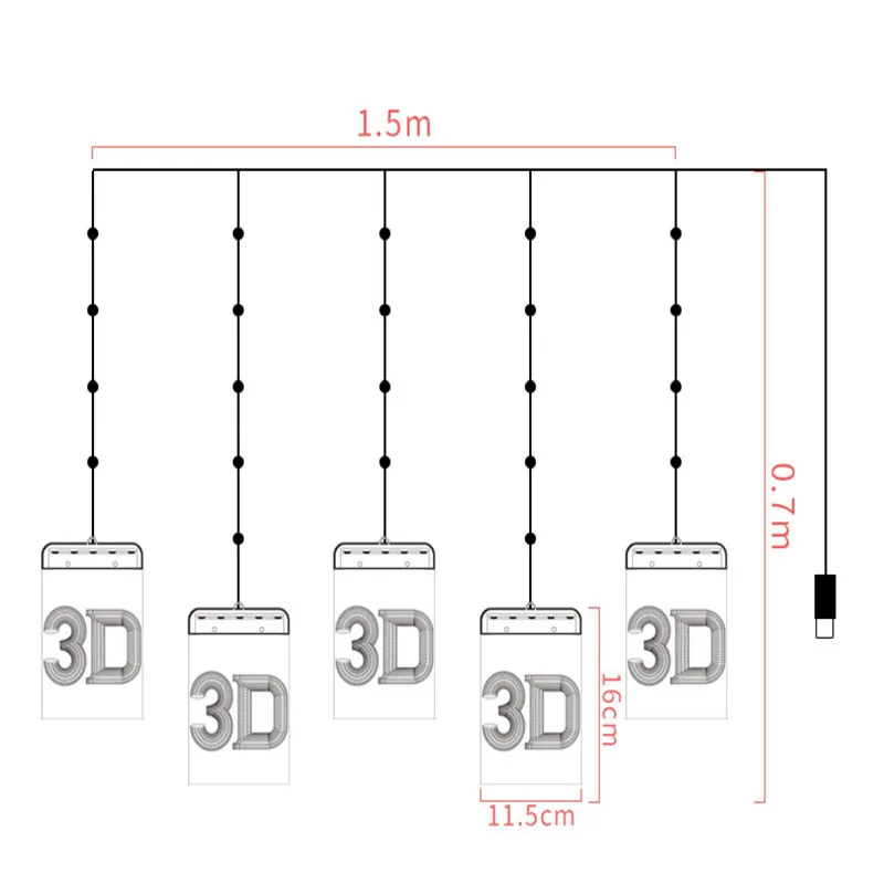 Имя: декоративный подвесной светильник Материал: светодиодный + фотосинтеза доска Технические характеристики: Общая длина светильник строка * высокая (1,5*0,7 м) 3D окружающей среды светильник подвесной светильник/длинные * высокая (11,5*16 см) Мощность: 5V Мощность: USB Кол-во Кулоны из нержавеющей стали: 5 шт. Применение: для праздничного украшения, макет сцены. Может быть украшен в окне, в комнате окна крыльца и так далее!