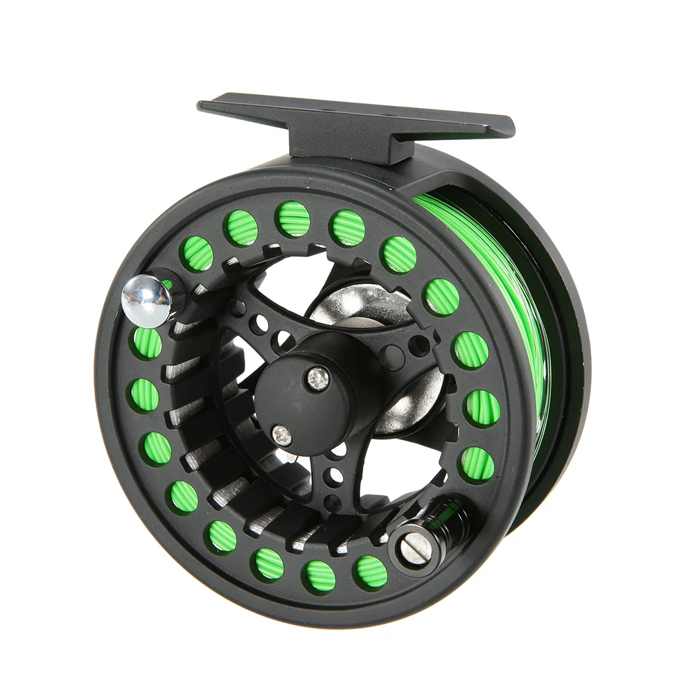 5/6 литой под давлением алюминиевый рыболовный катушка с предварительной катушкой и леской для нахлыста. Передаточное отношение-1:1; Шарикоподшипники: 2 + 1 шарикоподшипник.