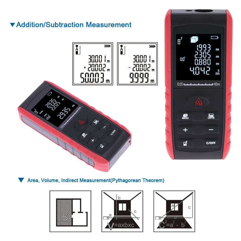 Лазерный измеритель расстояния с высокой точностью может использоваться для измерения расстояния, площади и объема. Он также используется для непрямого измерения с помощью пифагорной теоры. Продукт портативный и надежный в измерении, делая ваши измерения более точными, простыми и быстрыми. Измеритель может широко использоваться в строительстве и промышленности, особенно в крупных областях, таких как комнаты, квартиры, здания, реальные дома, фабрики и т. Д.