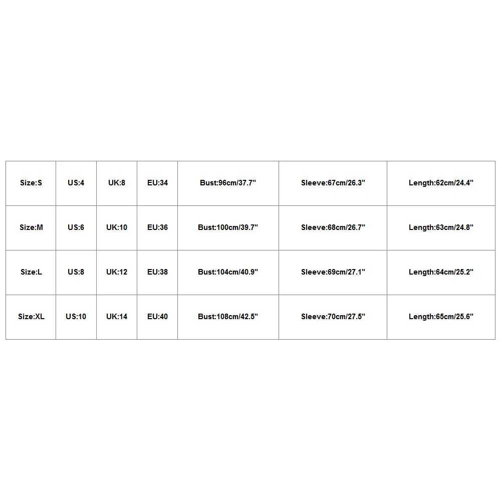 Размер: S США: 4 Великобритания: 8 ЕС: 34 Бюст: 96 см/37,7" Рукав: 67 см/26,3" Длина: 62 см/24,4" Размер: M США: 6 Великобритания: 10 ЕС: 36 Бюст: 100 см/39,7" Рукав: 68 см/26,7" Длина: 63 см/24,8" Размер: L США: 8 Великобритания: 12 ЕС: 38 Бюст: 104 см/40,9" Рукав: 69 см/27,1" Длина: 64 см/25,2" Размер: XL США: 10 Великобритания: 14 ЕС: 40 Бюст: 108 см/42,5" Рукав: 70 см/27,5" Длина: 65 см/25,6"