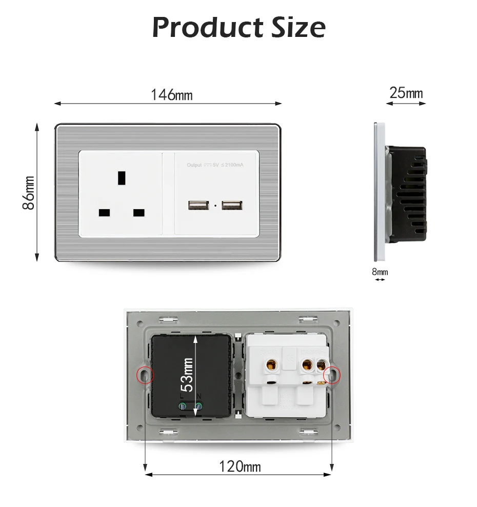 Esooli 146*86 мм UK Стандартный Мощность розетка с двумя USB зарядка Порты и разъёмы для мобильных устройств 5 V 2.1A Нержавеющая сталь Панель электрическая розетка