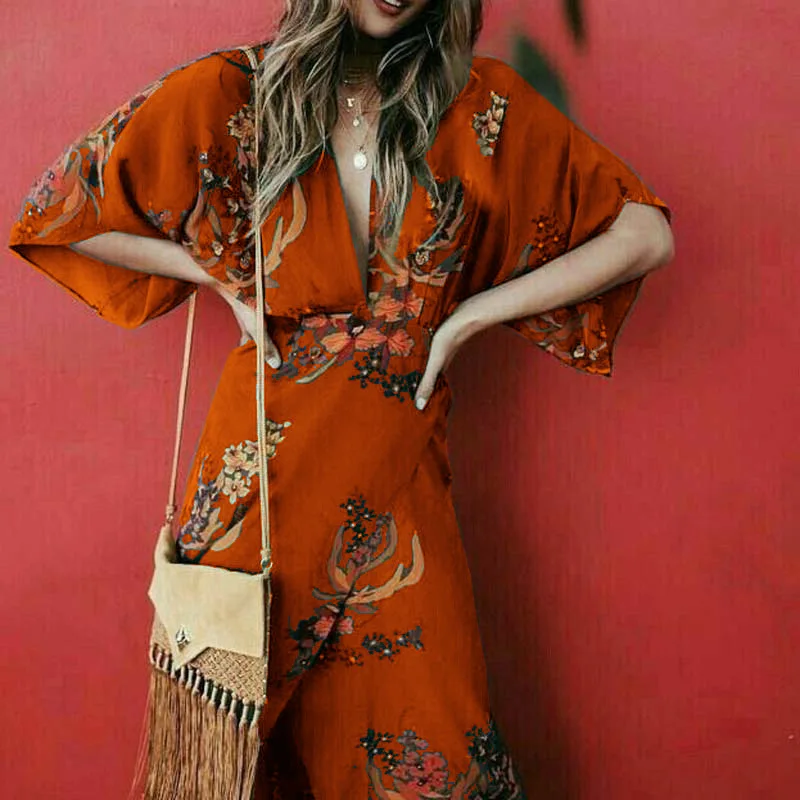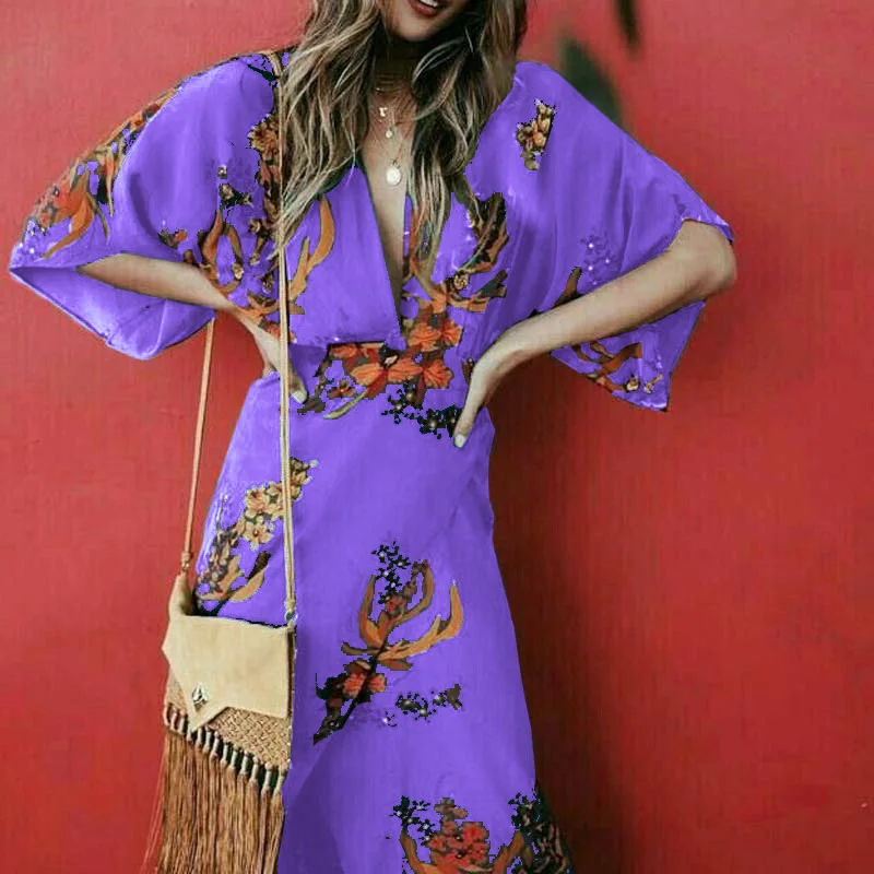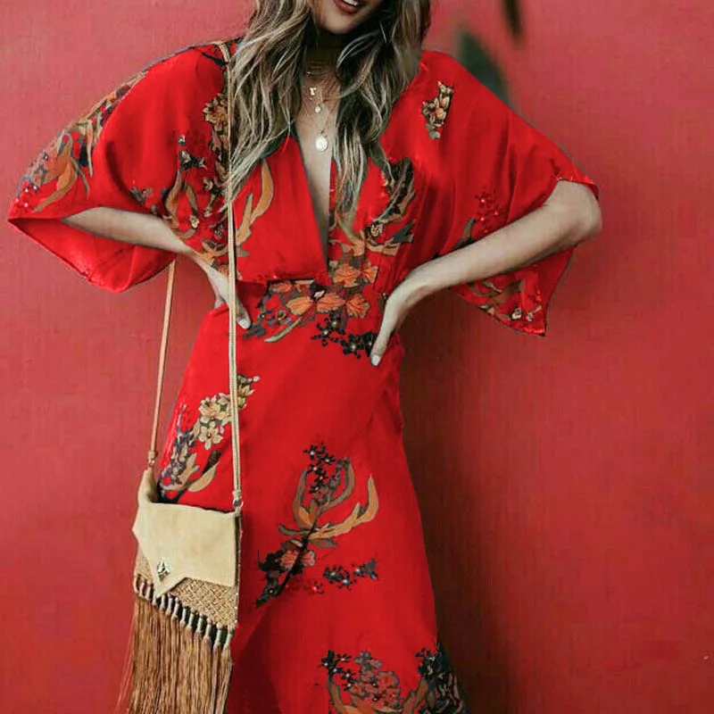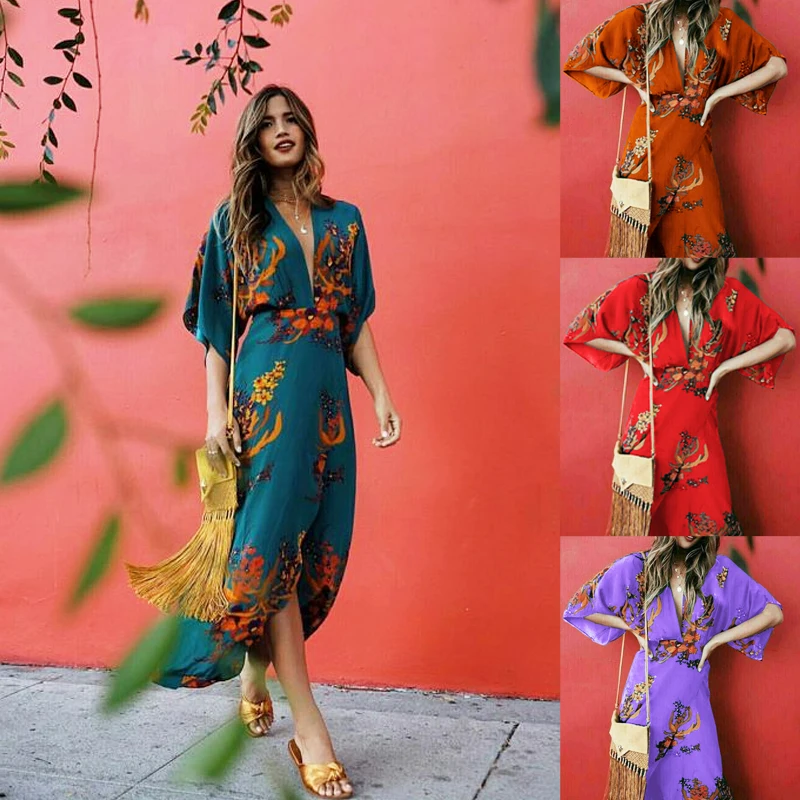 Женское длинное коктейльное платье в стиле бохо с цветочным принтом и v-образным вырезом, вечерние пляжные платья, сарафан