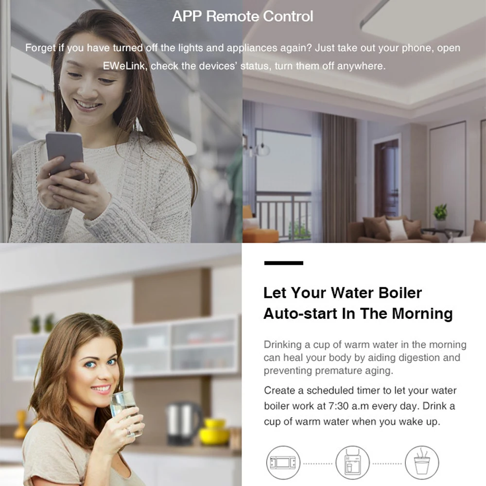 Переключатель Sonoff RF делает все бытовые приборы умными. Пока мобильный телефон имеет сеть 2G/3G/4G/WiFi, пользователи могут удаленно управлять устройствами, включив их в любой момент. Другая доступная функция-установить графики синхронизации для приборов, которые могут включать таймеры по расписанию/обратному отсчету/циклу, и, таким образом, помочь пользователям поддерживать легкий срок службы.