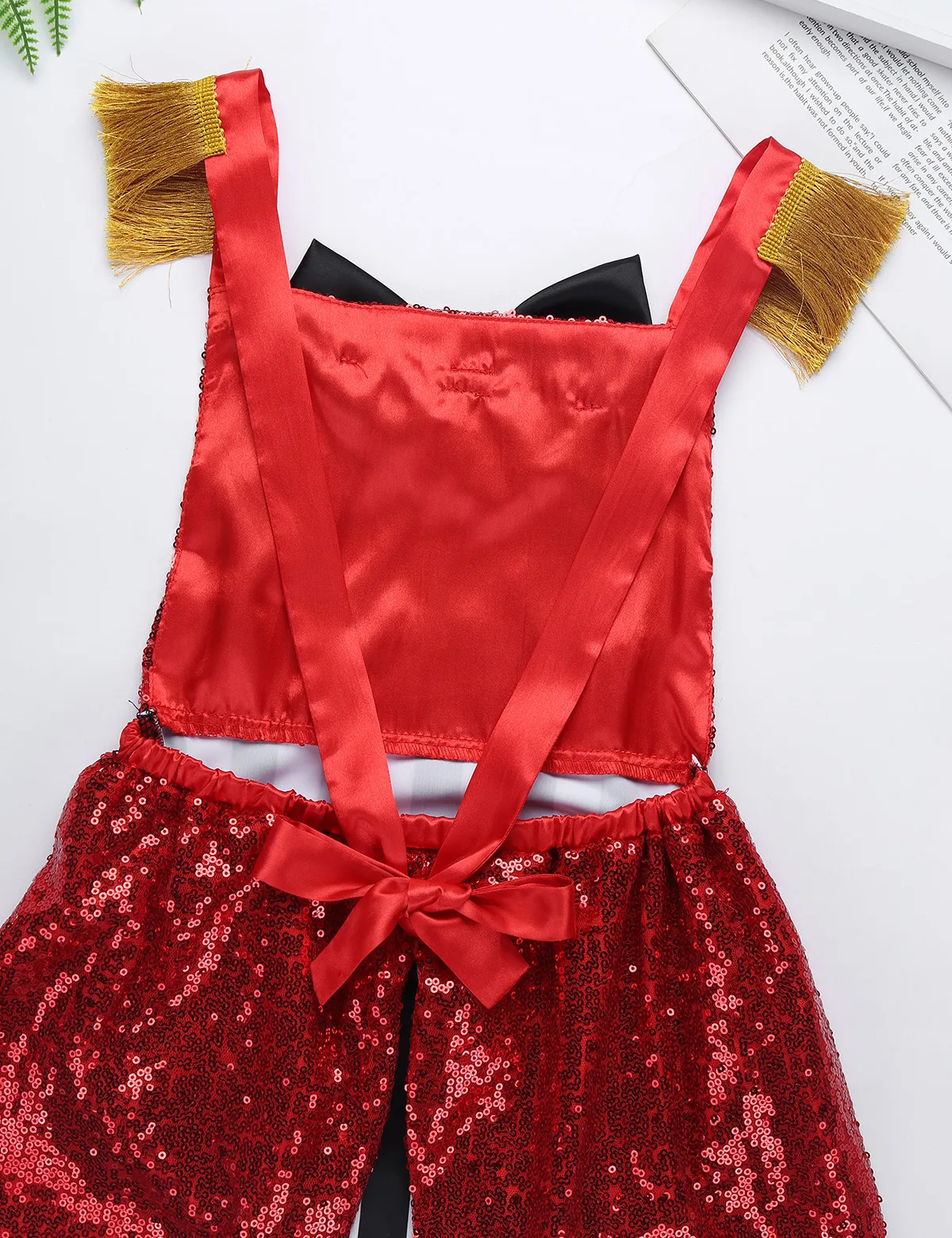 Бретельки из ленты можно завязать в бант сзади, плечи украшены бахромой. Лиф с блестками спереди украшен бантом, пуговицами и золотыми плетеными вставками.